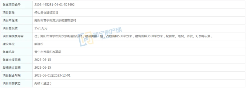 总投资1525万元,位于普宁市流沙东街道新坛村,建设美宿一幢,占地面积500平方米,建筑面积3500平方米,配套床、电视、沙发、灯饰等设备。项目起止年限2023-06-01至2023-12-01