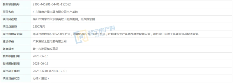总投资2200万元,位于普宁市大坝镇英歌山北路南侧、坛西路东侧,本项目用地面积为5200平方米,总建筑面积为7800平方米,计划建设生产基地及其他配套设施,项目完工后用于电器安装与配送业务。建设单位为广东璀璨之星电器有限公司,项目起止年限2023-06-01至2024-12-01