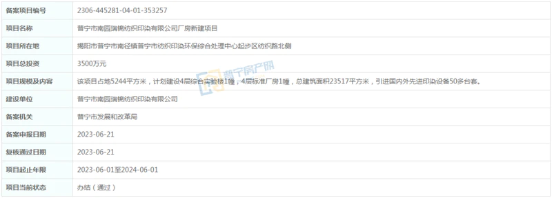总投资3500万元,位于普宁市南径镇普宁市纺织印染环保综合处理中心起步区纺织路北侧,该项目占地5244平方米,计划建设4层综合实验楼1幢,4层标准厂房1幢,总建筑面积23517平方米,引进国内外先进印染设备50多台套。建设单位为普宁市南园瑞锦纺织印染有限公司,项目起止年限2023-06-01至2024-06-01