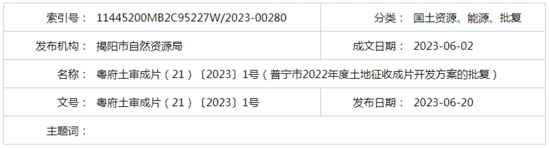 《普宁市人民政府关于审批《揭阳市普宁市2022年度土地征收成片开发方案》的请示》(普府〔2023〕8号)收悉。根据《中华人民共和国土地管理法》第四十五条规定和《广东省人民政府关于调整实施一批省级自然资源行政职权事项的决定》(粤府〔2022〕69号)等文件规定,现批复如下: