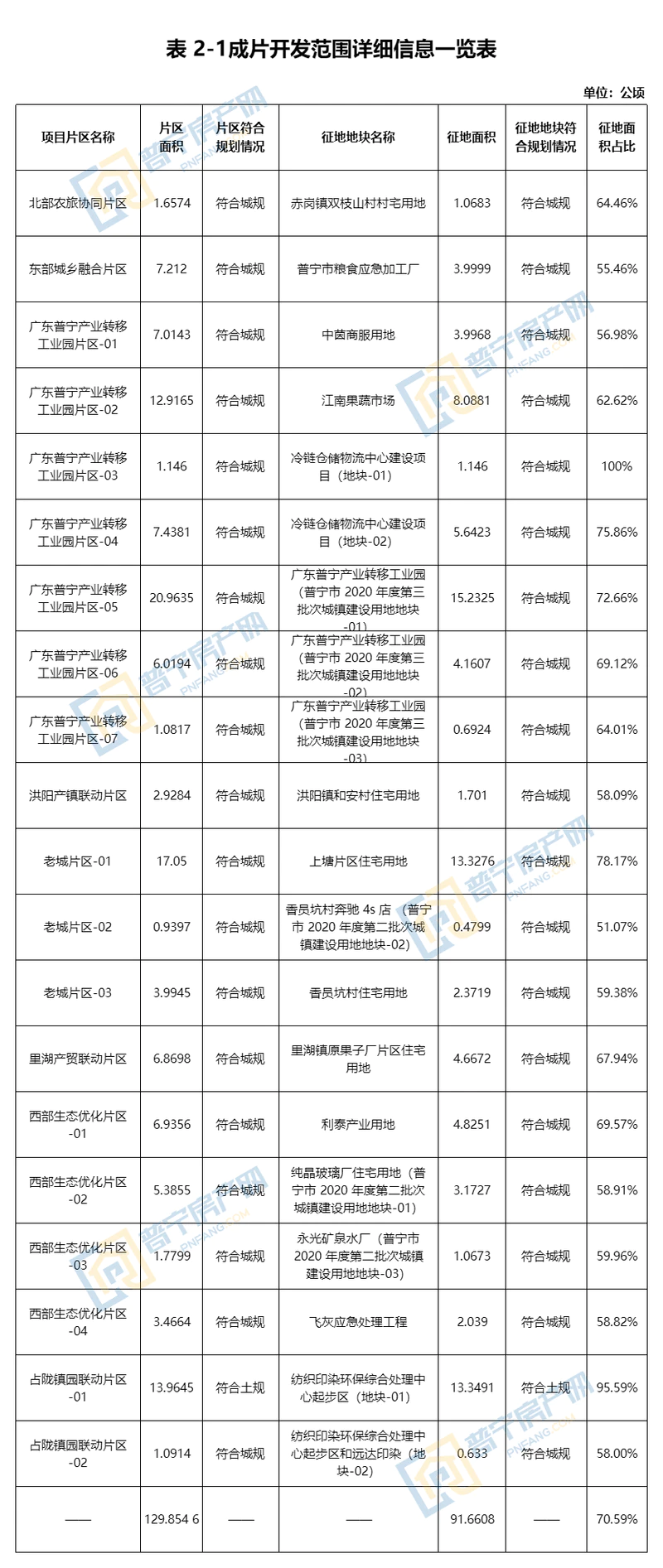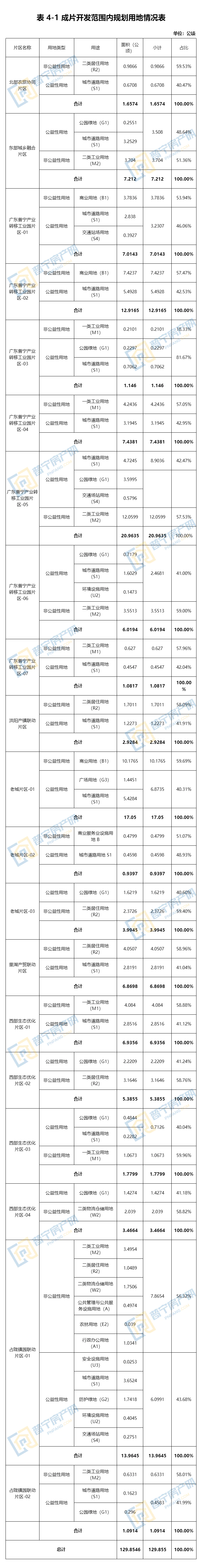 本次普宁市成片开发区域内包含20个片区,各个片区范围内基础设施、公共服务设施以及其他公益性用地比例均不低于40%,满足成片开发要求,各片区具体情况如下: