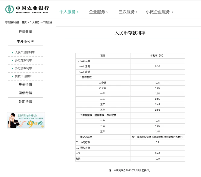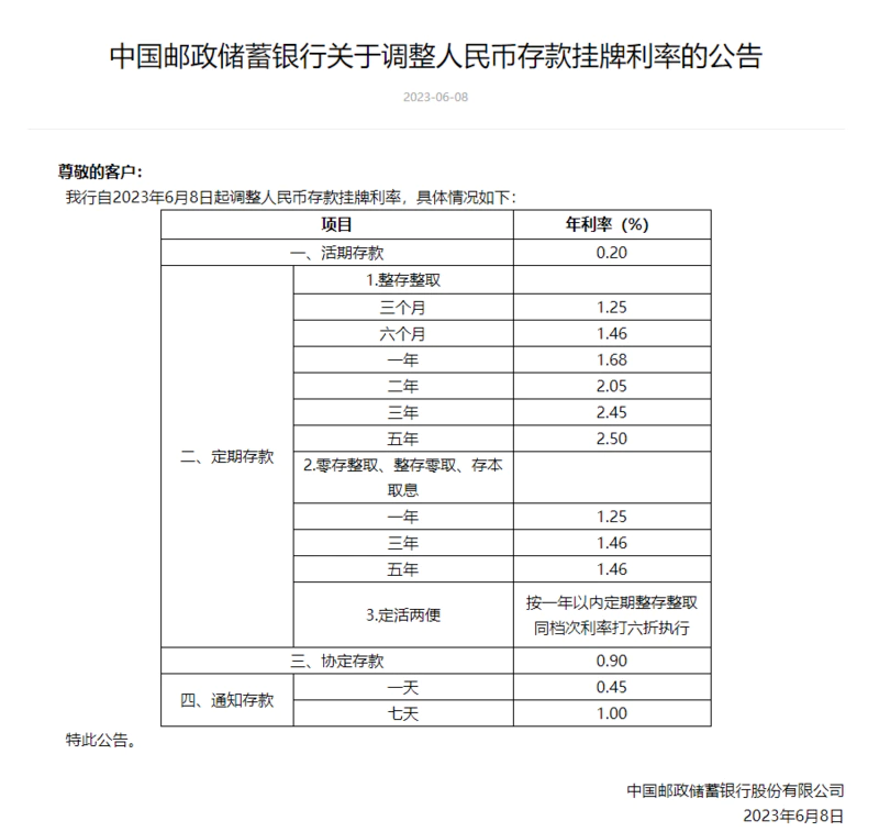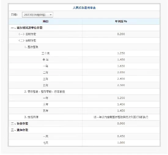 6月8日下调人民币活期存款利率,两年期、三年期和五年期人民币定期存款利率分别为2.05%、2.45%、2.5%。