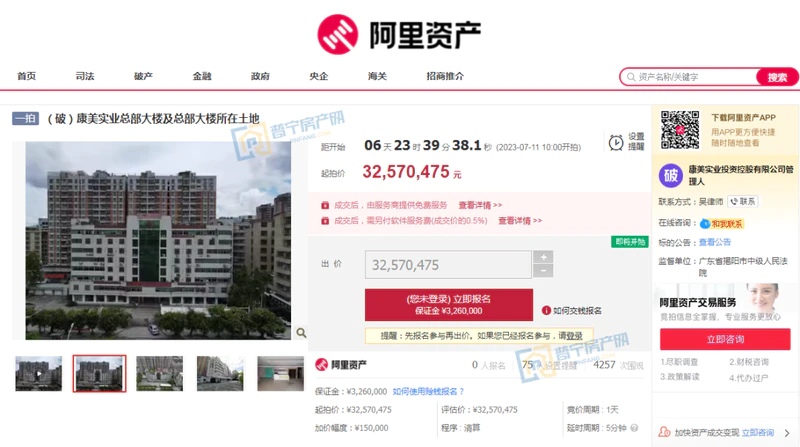 近日,康美实业总部大楼及总部大楼所在土地在阿里拍卖网进行拍卖,起拍价3257万,保证金326万,将于7月11日进行拍卖,具体内容如下: