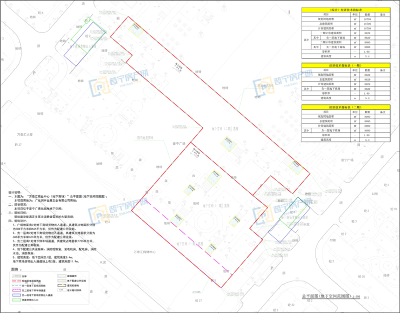 一、本图为:“万泰汇商业中心(地下商场)”总平面图(地下空间范围图);本项目用地为:广东润宇金属实业有限公司用地;