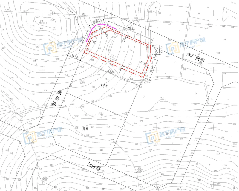 6.红点划线为用地范围线,品红线为机动车禁止开口线;