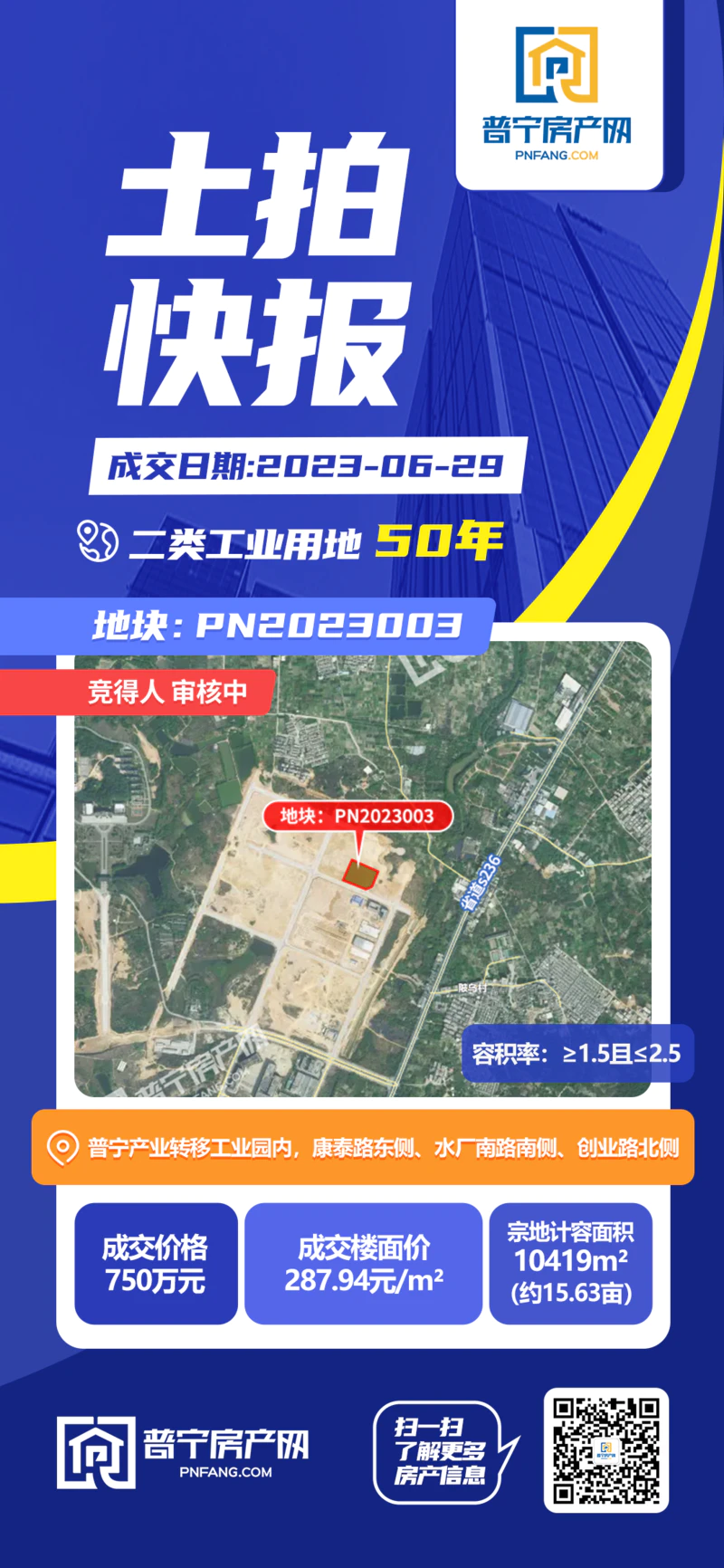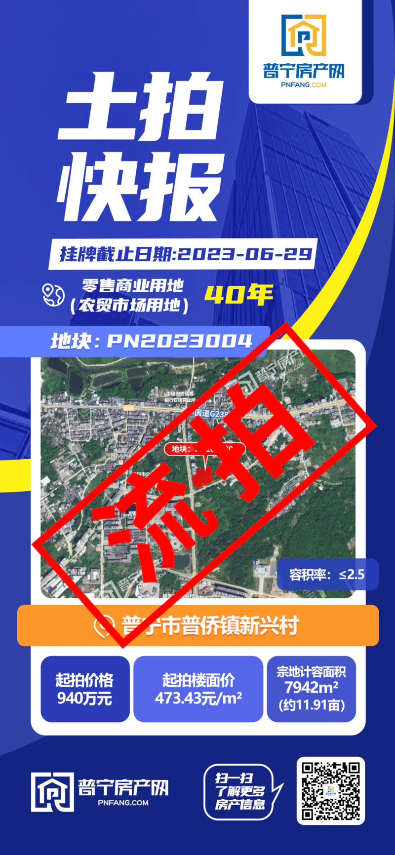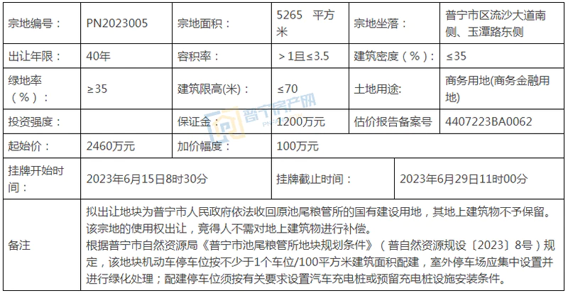 PN2023005地块位于普宁市区流沙大道南侧、玉潭路东侧,占地面积5265 平方米,以2460万成功出让,为40年商务用地(商务金融用地)。