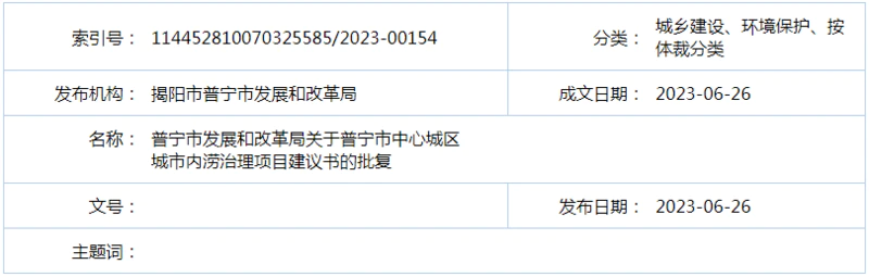 一、为进一步补齐中心城区排水防涝设施短板,提升我市城市内涝防治水平,切实保障城市安全运行,同意普宁市中心城区城市内涝治理项目建设(投资项目统一代码:2306-445281-04-01-853528)。