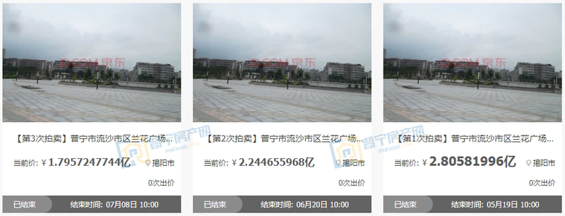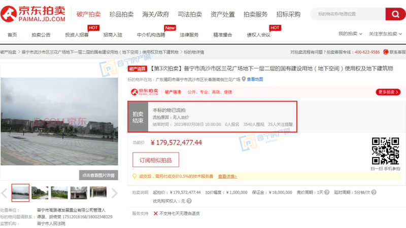 2023年7月7日至8日,普宁市流沙市区兰花广场地下一层二层的国有建设用地(地下空间)使用权及地下建筑物进行第三次拍卖,起拍价179,572,477.44元,报名保证金1800万,最终因无人出价而以流拍告终,土地使用年限为40年,至2051年7月27日。此次拍卖吸引3540人围观,25人设置提醒。