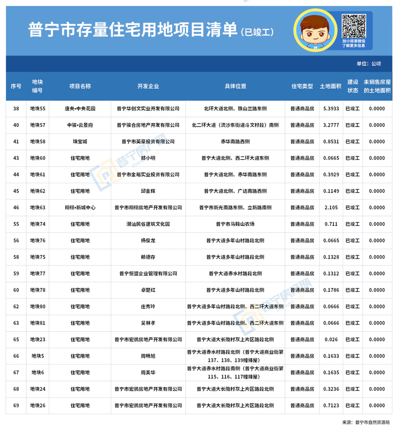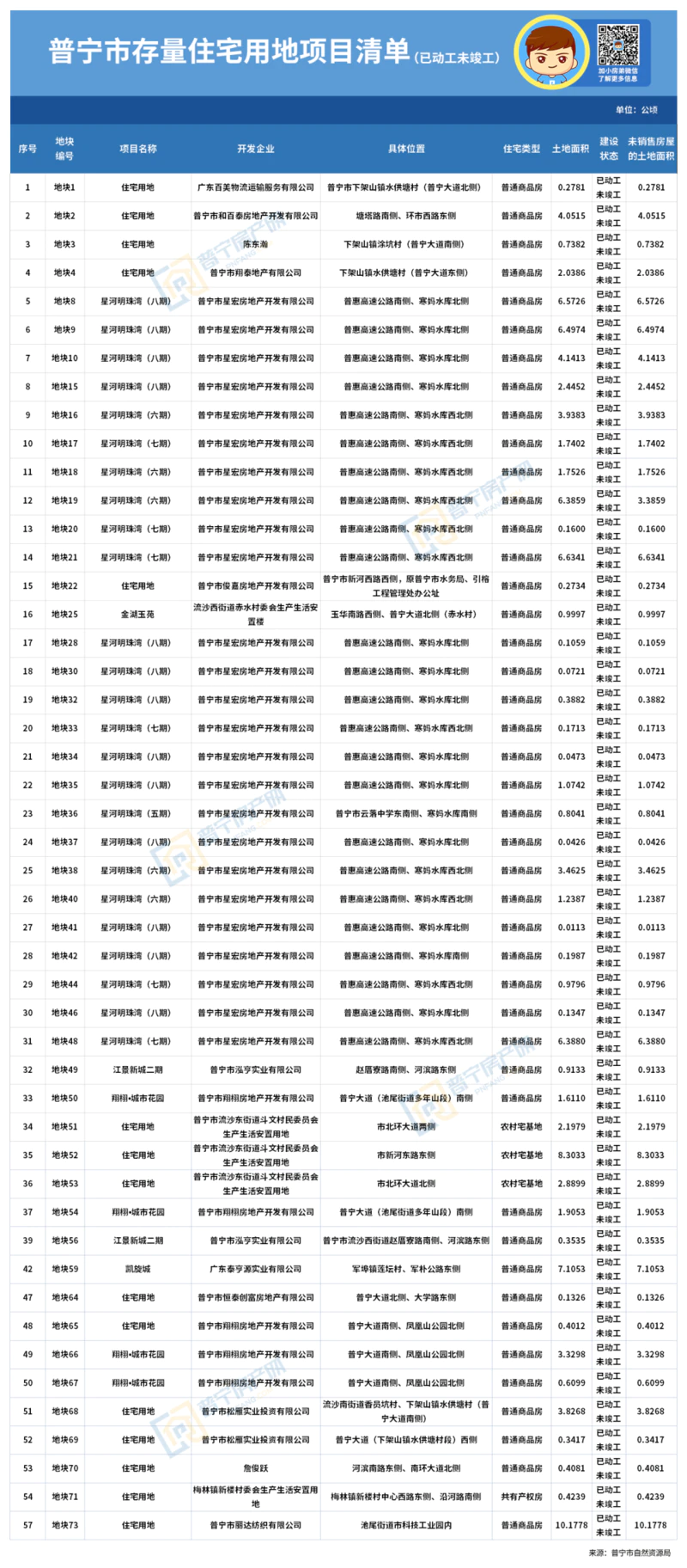今天,普宁市自然资源局更新发布了普宁市存量住宅用地情况表,据了解,这是今年以来第三次更新,本次普宁市存量住宅用地项目总数73宗,较上次减少12宗,总面积134.6466公顷(2019.699亩),较上次减少6.4911公顷(97.3665亩)。