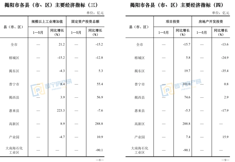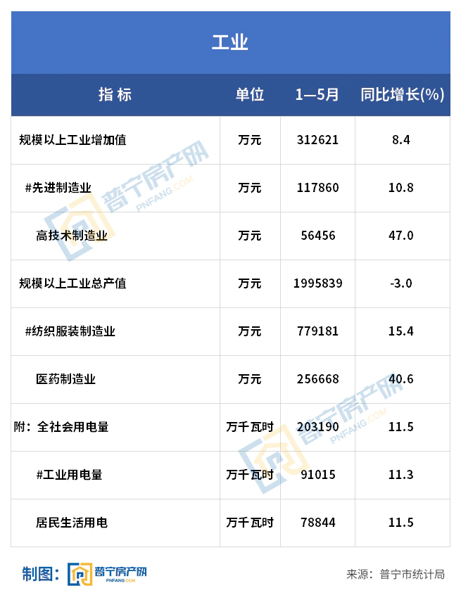 近日,普宁市统计局分别发布了2023年5月统计月报和2023年1-5月普宁经济运行简况。1-5月,全市各地各有关部门认真贯彻落实普宁市委、市政府各项工作部署,聚焦重点,抓经济、推招商、促项目,全市经济运行延续恢复态势,主要经济指标整体向好。据了解,1-5月房屋施工面积326.05万平方米,下降28.4%;商品房销售面积26.73万平方米,增长14.3%。