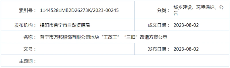 普宁市万邦服饰有限公司地块“工改工”“三旧”改造方案
