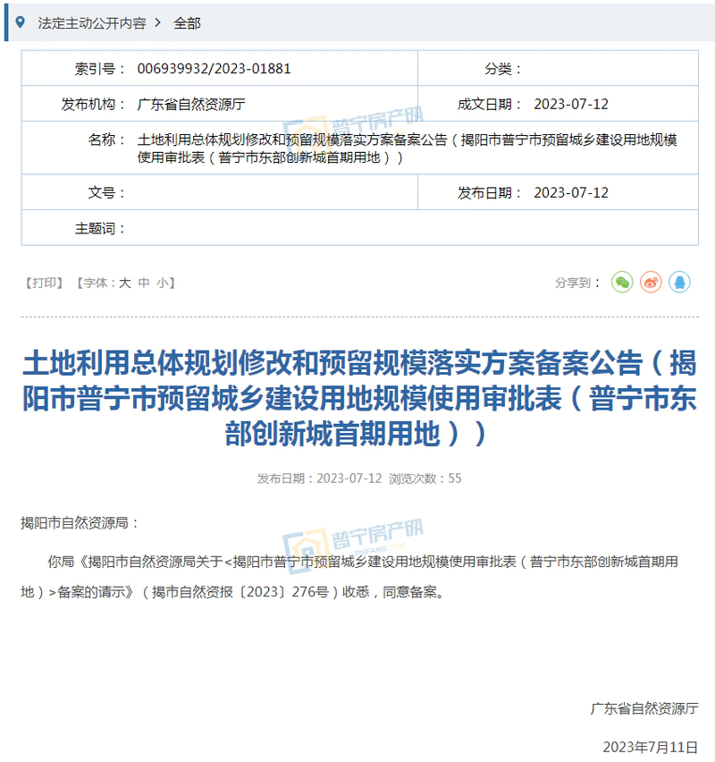你局《揭阳市自然资源局关于<揭阳市普宁市预留城乡建设用地规模使用审批表(普宁市东部创新城首期用地)>备案的请示》(揭市自然资报〔2023〕276号)收悉,同意备案。