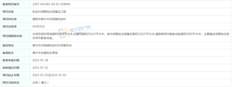 位于普宁市洪阳镇和安村,总投资4100万元,本项目规划用地面积6000平方米,总建筑面积25625平方米。其中保障性住房建设面积23625平方米,道路等相关配套设施面积2000平方米。主要建设保障性住房及相关配套设施。建设单位为普宁市洪阳镇和安村村民委员会,项目起止年限2023-07-01至2025-07-01