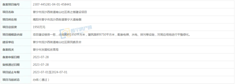 位于普宁市流沙西街道普宁大道南侧,总投资1950万元,项目建设楼房一栋,占地面积1950平方米,建筑面积9750平方米,配套电梯、水电、排污等设施,对周边场地进行平整绿化。建设单位为普宁市流沙西街道南山社区居民委员会,项目起止年限2023-07-01至2024-07-01