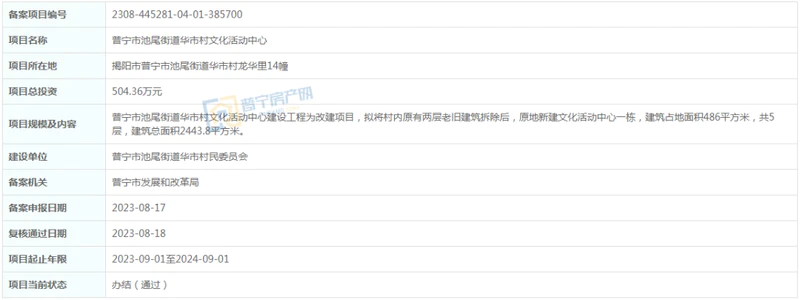 位于普宁市池尾街道华市村龙华里14幢,总投资504.36万元,普宁市池尾街道华市村文化活动中心建设工程为改建项目,拟将村内原有两层老旧建筑拆除后,原地新建文化活动中心一栋,建筑占地面积486平方米,共5层,建筑总面积2443.8平方米。建设单位为普宁市池尾街道华市村民委员会,项目起止年限2023-09-01至2024-09-01