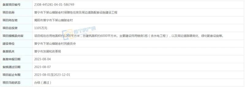 位于普宁市下架山镇陂老村,总投资1105万元,项目规划总用地面积约1200平方米,总建筑面积约6000平方米。主要建设民用楼房1栋(含水电工程),以及周边道路硬底化、绿化配套设施等。建设单位为普宁市下架山镇陂老村民委员会,项目起止年限2023-08-01至2023-12-01