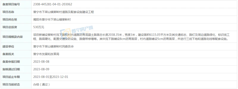 位于普宁市下架山镇葵岭村,总投资530万元,项目新铺设葵岭村流下路和村内道路沥青混凝土路面总长度2038.35米,宽度3米,建设面积6115.05平方米及其交通标志、路灯及周边道路绿化、标识线工程、路肩硬化、配置交通安防设施、路侧带修缮等。其中流下路铺设8cm沥青面层,村内道路铺设5cm沥青面层,并进行三线下地和道路划线等配套设施。建设单位为普宁市下架山镇葵岭村民委员会,项目起止年限2023-08-01至2023-12-01