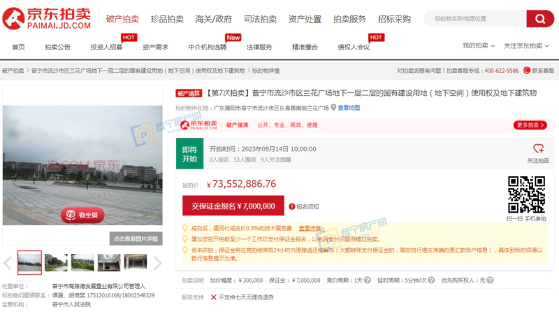 起拍价:73,552,886.76元,保证金:7,000,000元,增价幅度:300,000.00元及其整数倍。