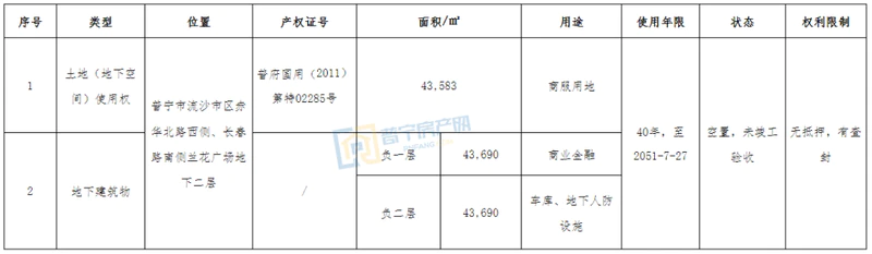 本次拍卖标的为高路德公司名下位于广东省普宁市流沙市区长春路南侧兰花广场地下一层、二层的国有建设用地(地下空间)使用权及地下建筑物,具体情况见下表: