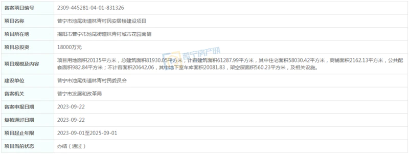 近日,据小房君了解,普宁市池尾(楼盘详情户型图相册地图)街道林青村民安居楼建设项目正式通过备案,总投资1.8亿,占地面积约30亩,具体内容如下: