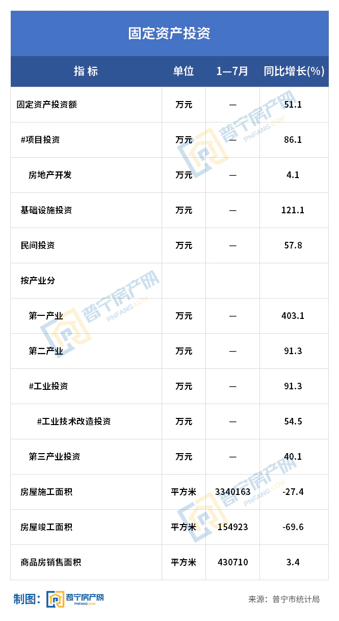 近日,普宁市统计局分别发布了2023年7月统计月报和2023年1-7月普宁经济运行简况。7月份以来,普宁市委、市政府紧紧围绕“创百强、上千亿”发展目标,聚焦重点,抓招商、上项目、拼经济、促发展,市场需求加快恢复,生产供给持续增加,全市经济运行呈现稳中向好态势。据了解,1-7月房屋施工面积334万平方米,下降27.4%;房屋竣工面积15.49万平方米,下降69.6%;商品房销售面积43.07万平方米,增长3.4%。