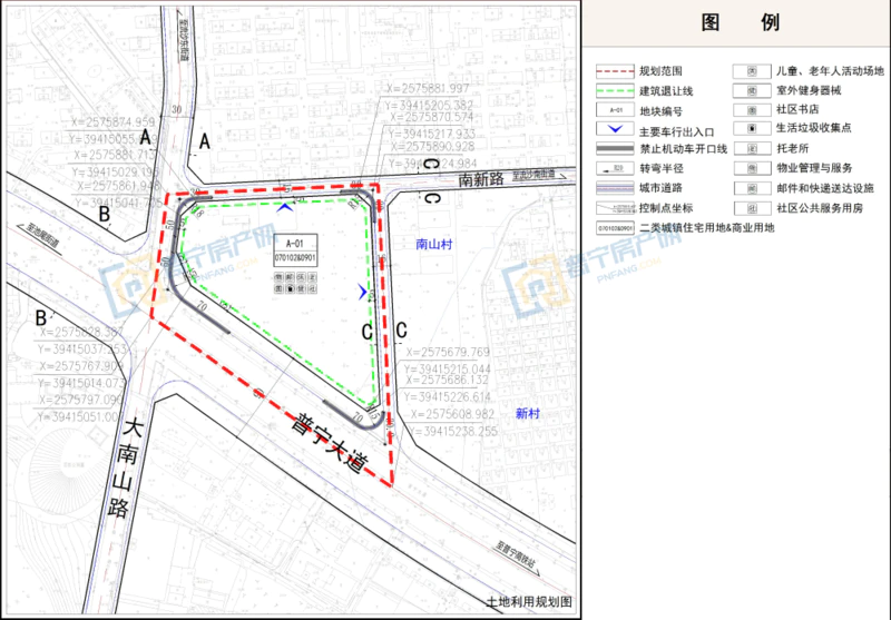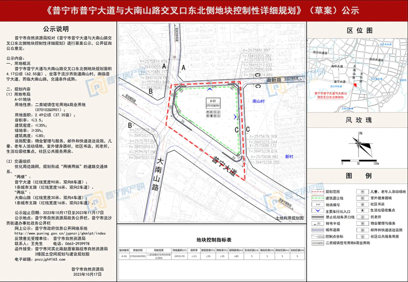 今天,普宁市自然资源局拟对《普宁市普宁大道与大南山(楼盘详情户型图相册地图)路交叉口东北侧地块控制性详细规划》进行草案公示,公开征询公众意见。据小房君了解,该地块为南山村片区成片开发地块,规划面积62.55亩,为二类城镇住宅用地&商业用地,建筑高度80米,配套儿童、老年人活动场地,室外健身器材,社区书店,托老所等。具体内容如下: