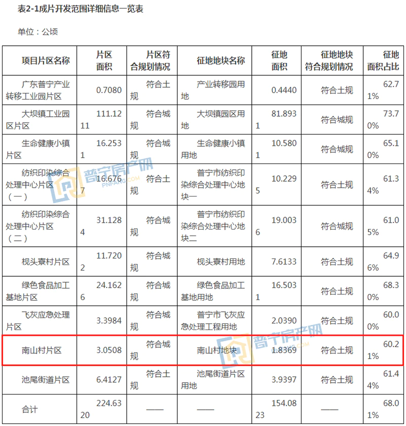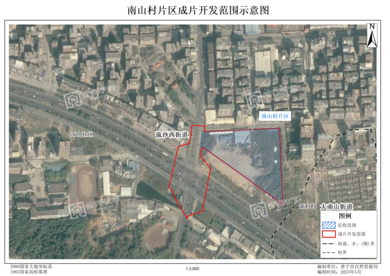 据《普宁市2023年度土地征收成片开发方案(第一批)(公示草案)》显示,此次公示的地块为南山村片区,将与周边土地利用充分衔接,用于建设产业园区,提升城市价值,提高城市建设的品位和内涵。南山村片区总面积3.0508公顷(45.762亩),拟征地面积1.8369公顷(27.5535亩),计划2024年完成土地征收,开发时序2024年。