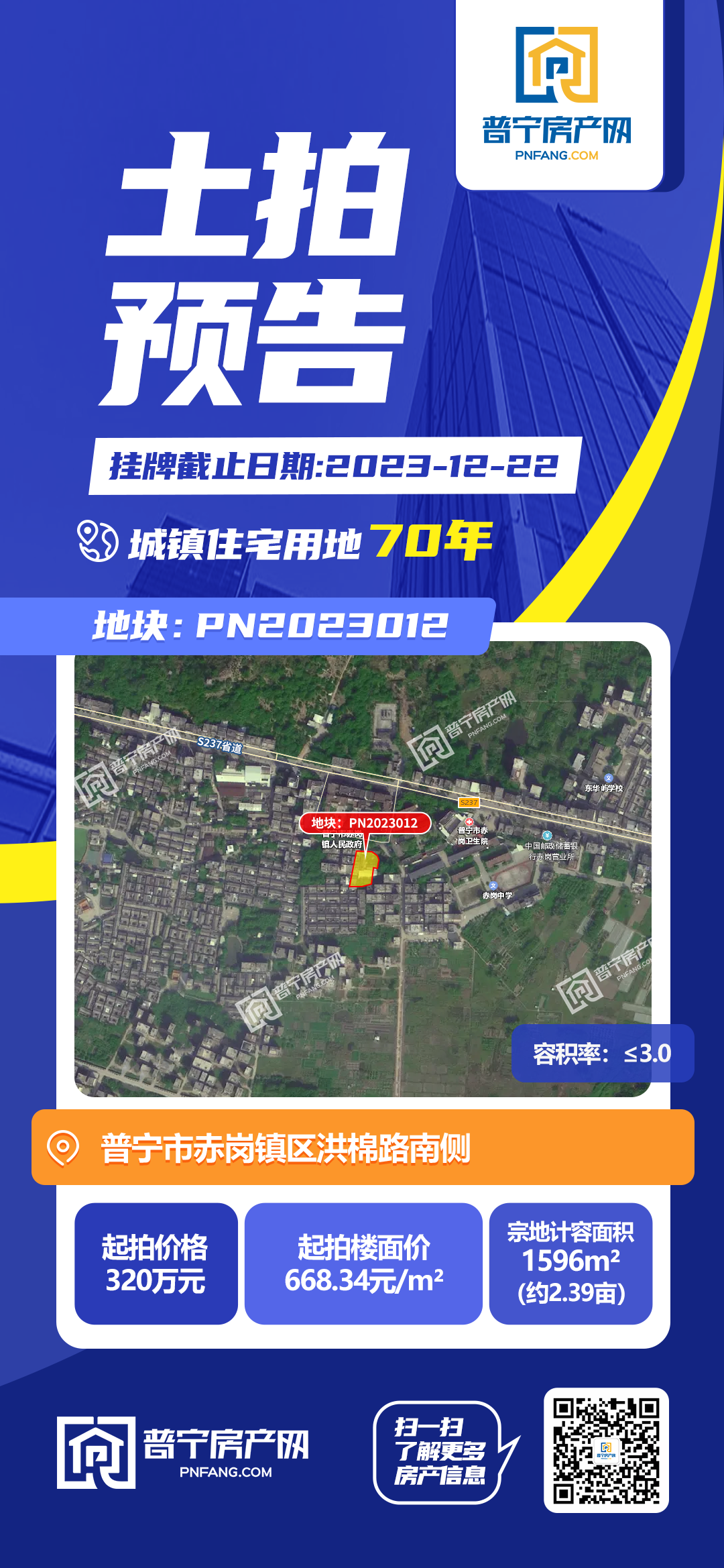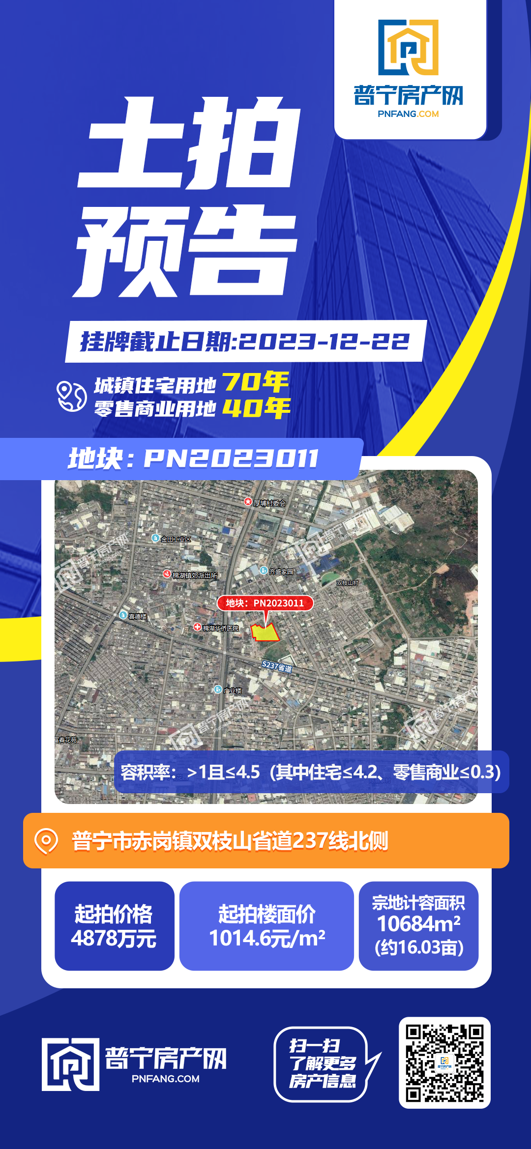 出让年限:住宅70年、商业40年PN2023011号地块所有建设内容应严格按照《普宁市赤岗镇双枝山省道237线北侧地块规划条件》(普自然资规设〔2023〕23号)规定执行。