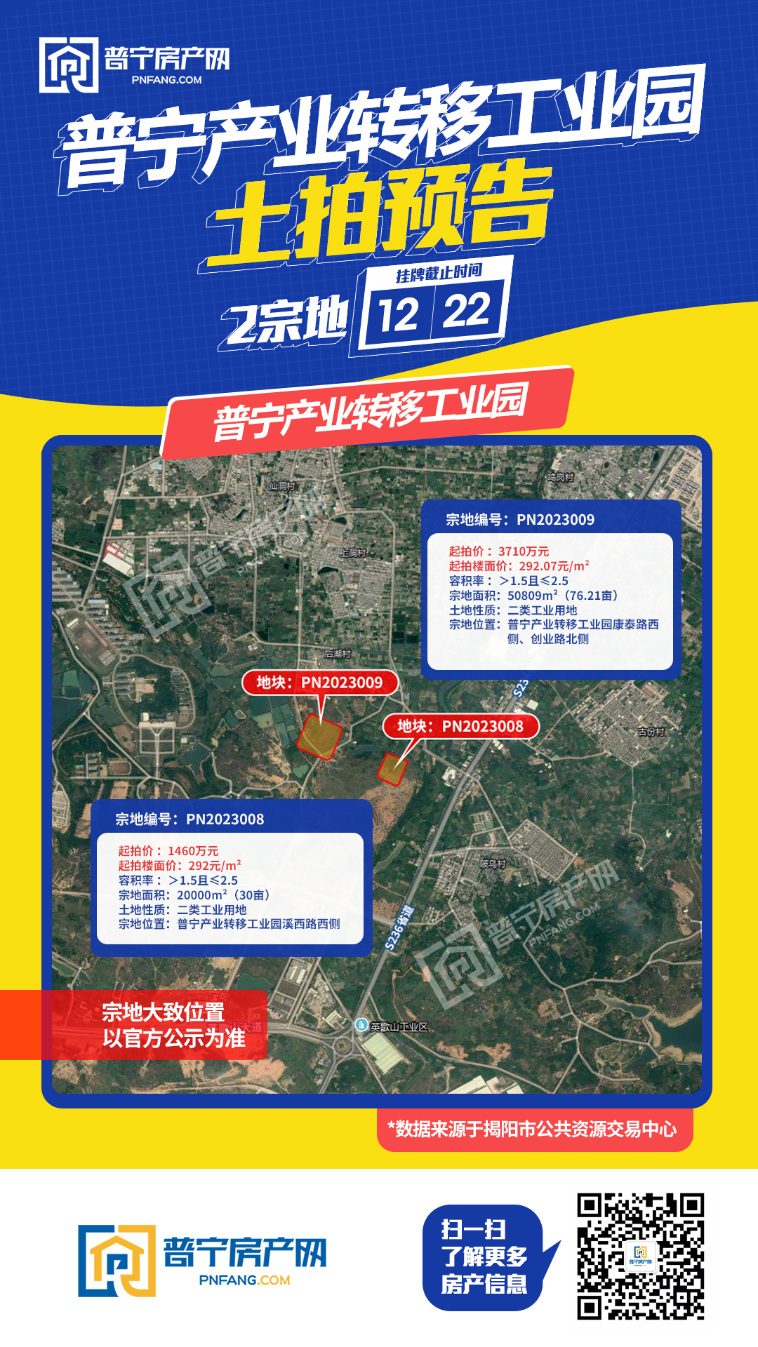 今天,经经普宁市人民政府批准,普宁市自然资源局委托揭阳市公共资源交易中心以网上挂牌方式出让九幅地块的国有建设用地使用权,将于12月22日开拍,分别为70年城镇住宅用地、40年商业用地、50年二类工业用地和中小学用地,总出让面积137512平方米(约206.27亩),总起拍价15406万元,具体内容如下:
