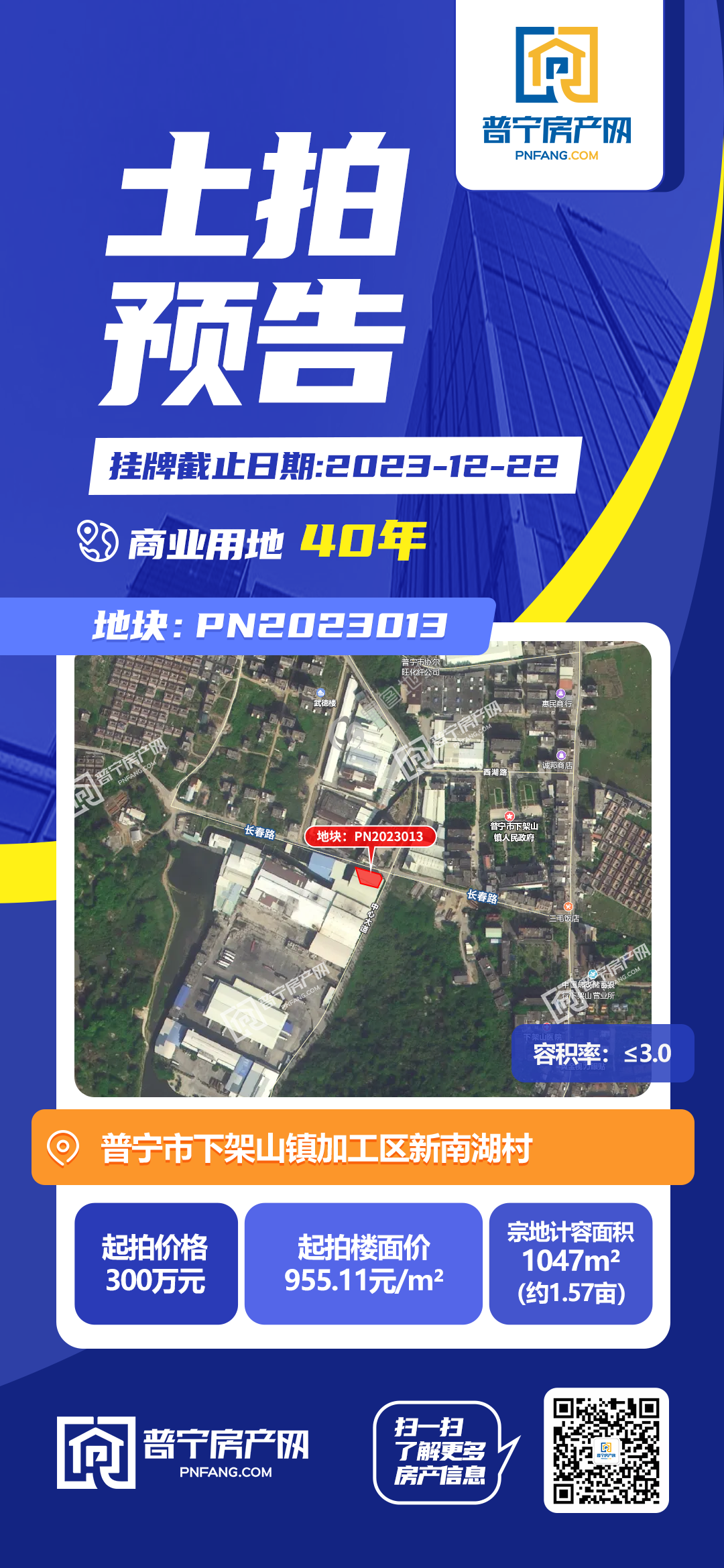 出让年限:40年PN2023013号地块所有建设内容应严格按照《普宁市食品总公司下架山食品公司地块规划条件》(普自然资源规设〔2023〕12号)规定执行。该宗用地为原普宁市食品总公司下架山食品公司用地,其土地使用权及地面建筑物由市政府依法收回。地上附着物按评估价格71.60万元作为固定价,列入土地出让价,以房地产整体一并出让,地上构建筑物可保留并继续利用开发。地块竞得人应自行处理相邻地块关系;该地块须配建微型消防站、公厕(建筑面积30—80平方米)和垃圾收集站。