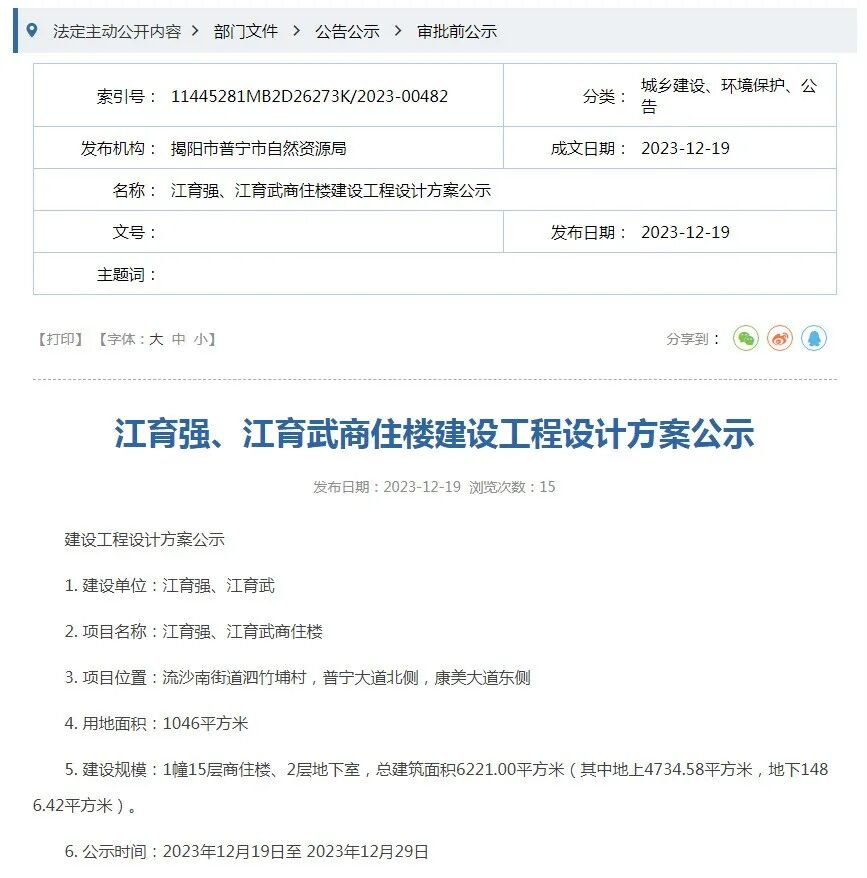 近日,据小房君了解,泗竹埔村江育强、江育武商住楼设计方案对外公示,占地约1.57亩,将建设1幢15层商住楼,共26户,30个停车位。具体内容如下: