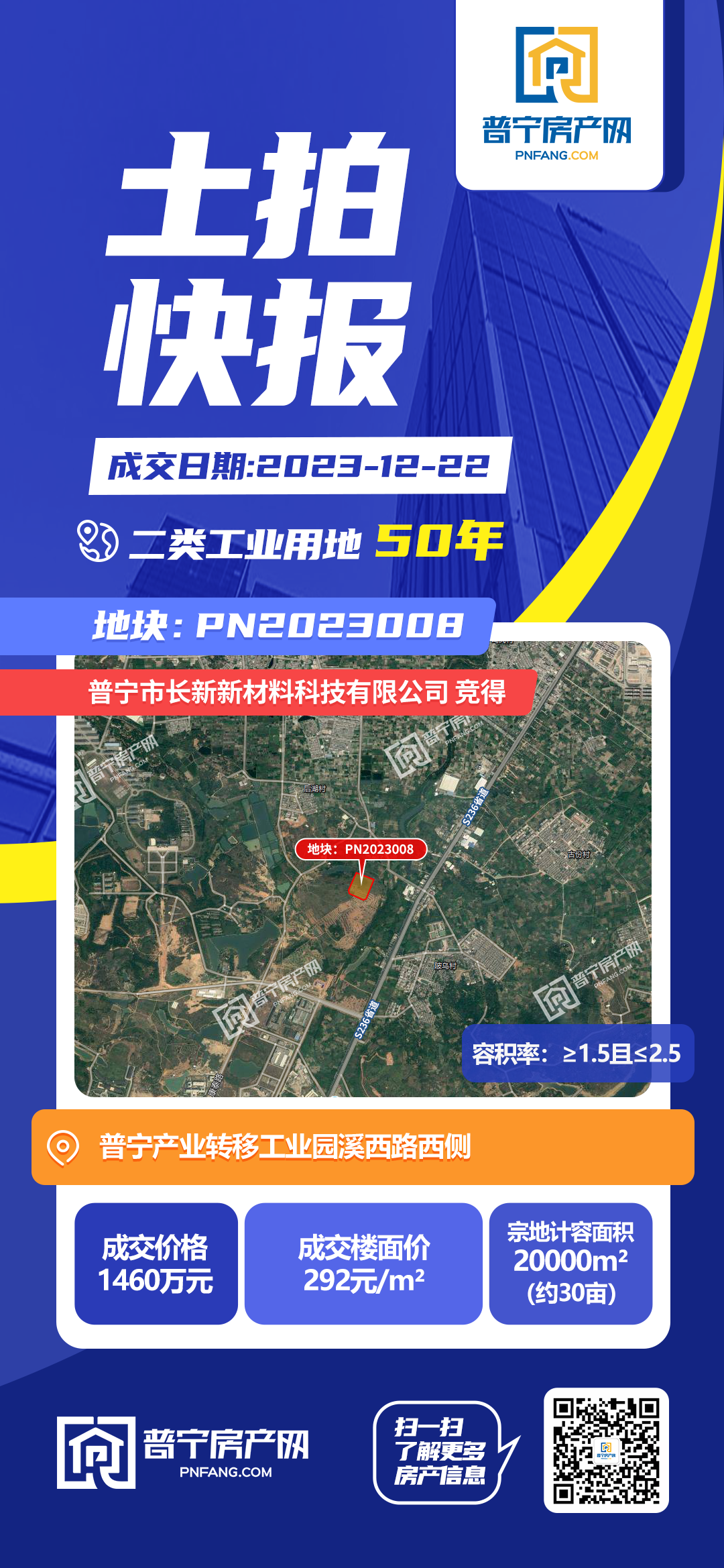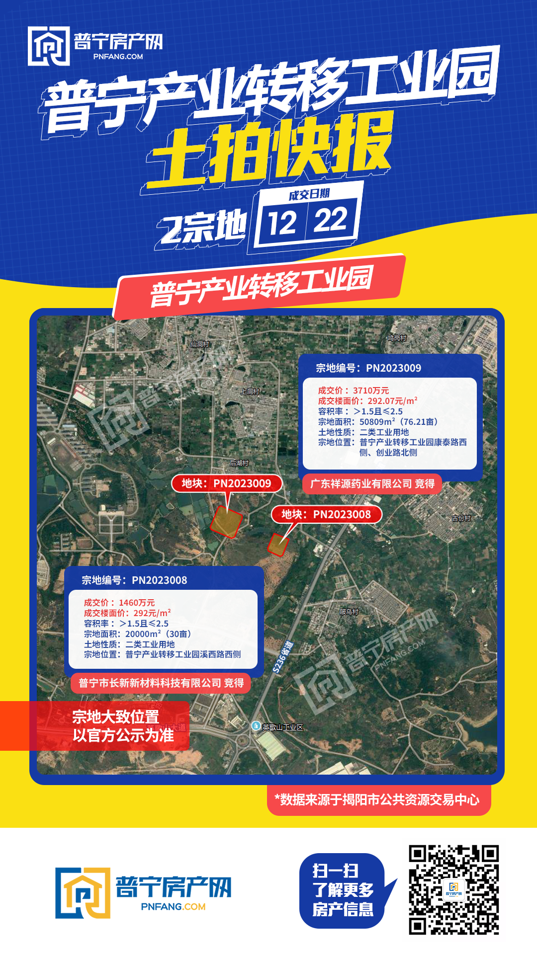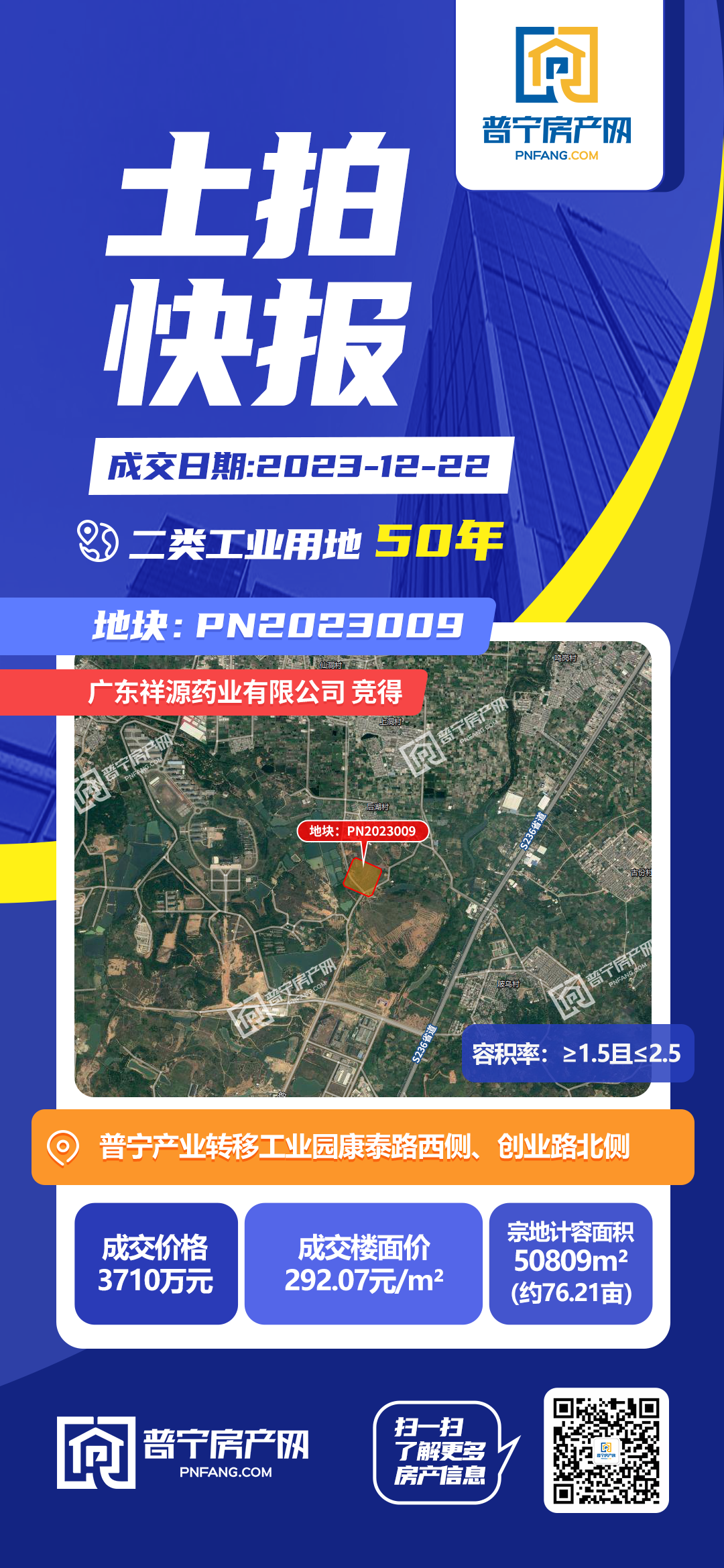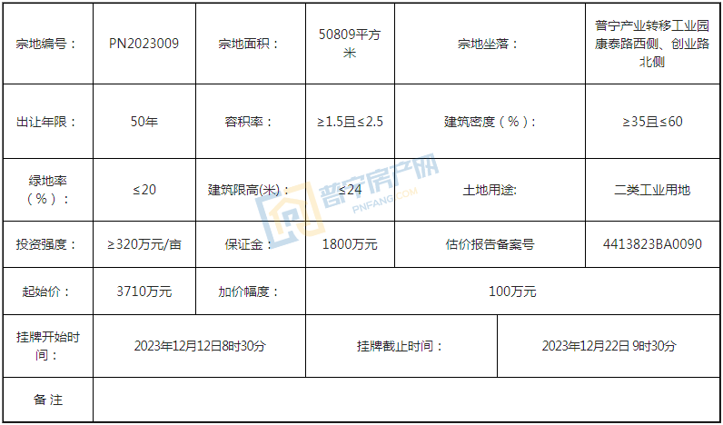 PN2023009地块以3710万元成功出让,成交楼面价292.07元/㎡,由广东祥源药业有限公司竞得。地块位于普宁产业转移工业园康泰路西侧、创业路北侧,占地面积50809平方米,为50年二类工业用地。