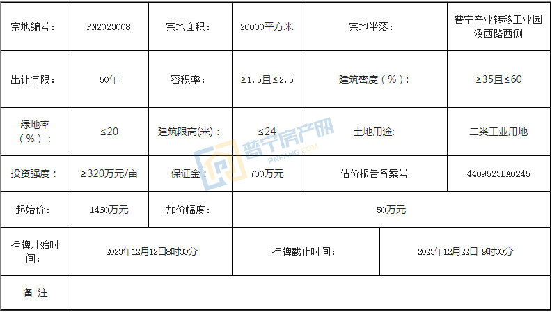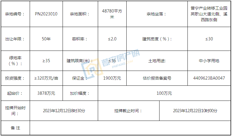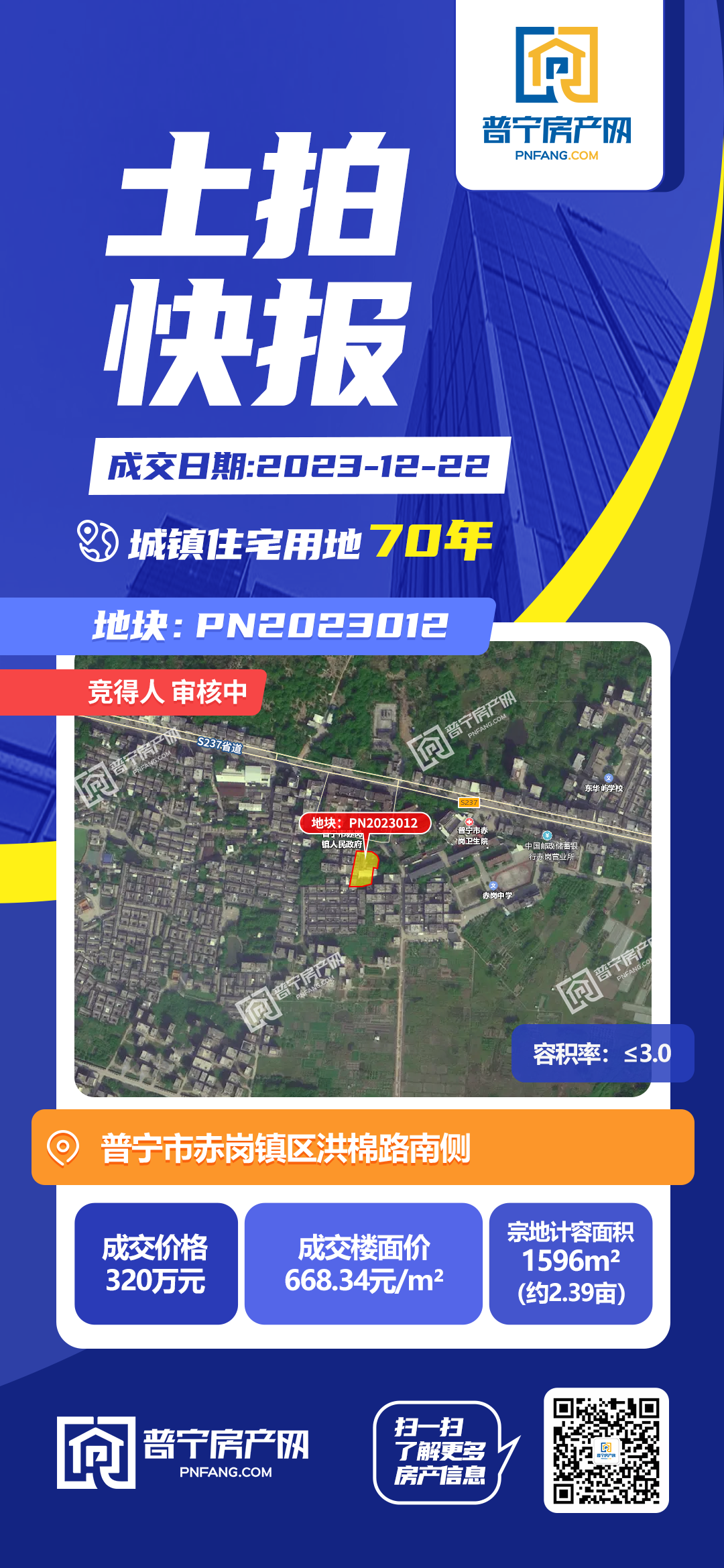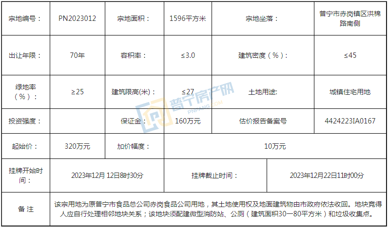 PN2023012地块位于普宁市赤岗镇区洪棉路南侧,占地面积1596平方米,以320万元成功出让,成交楼面价668.34元/㎡,为70年城镇住宅用地。