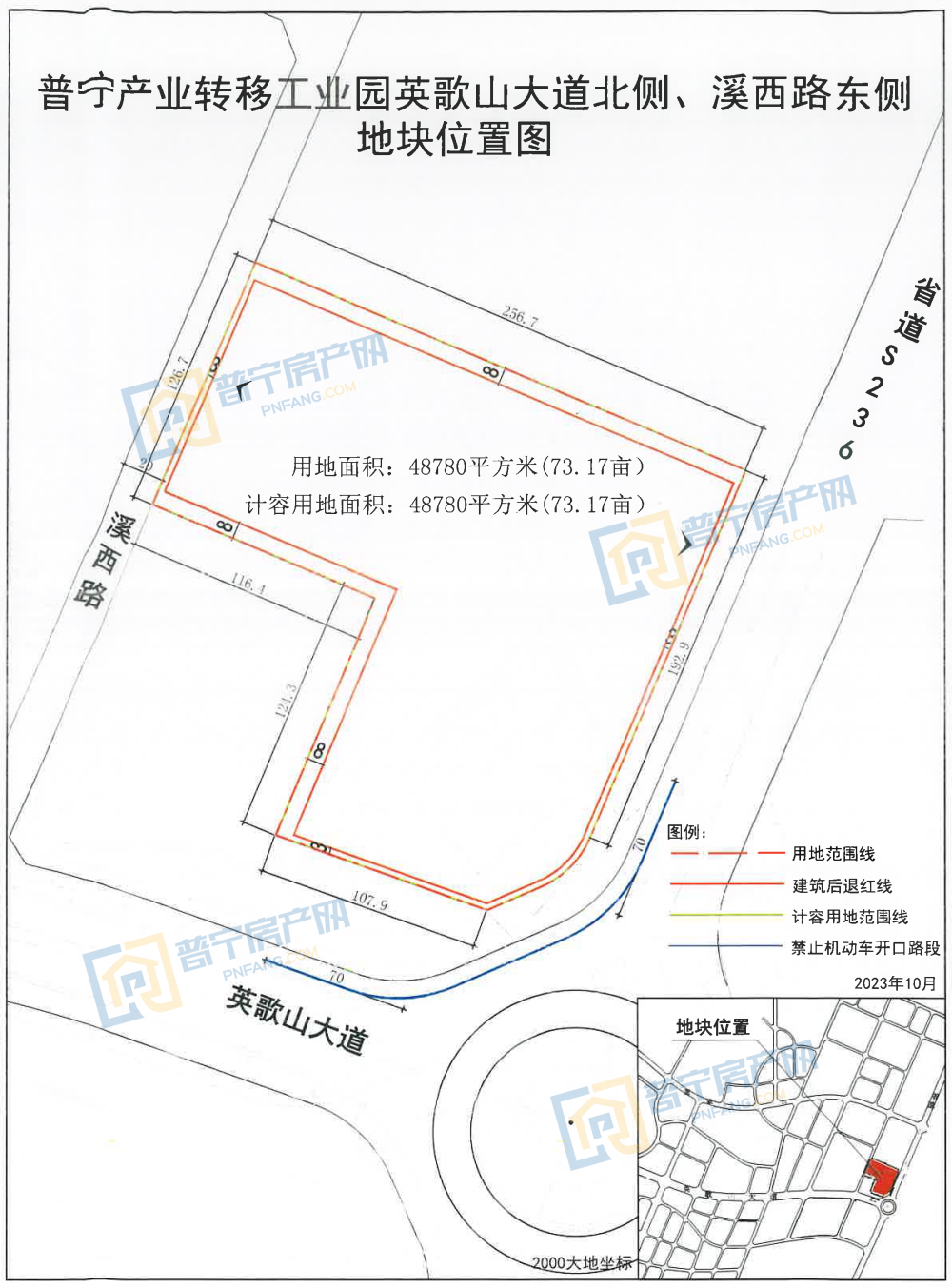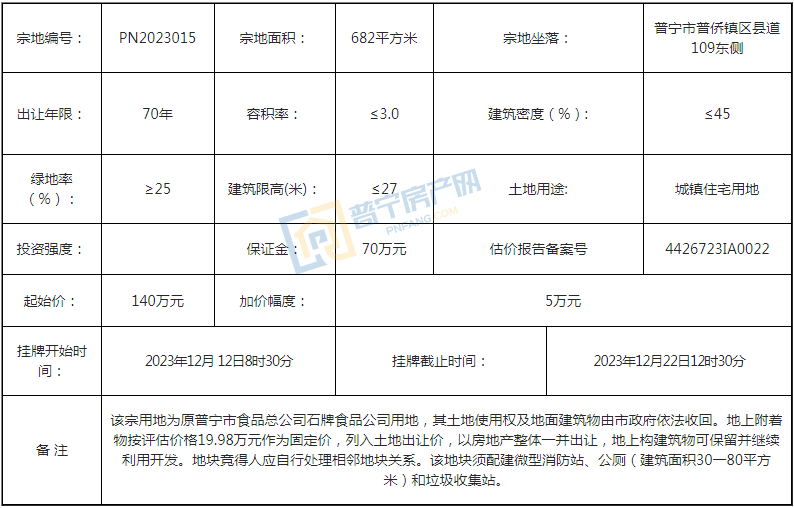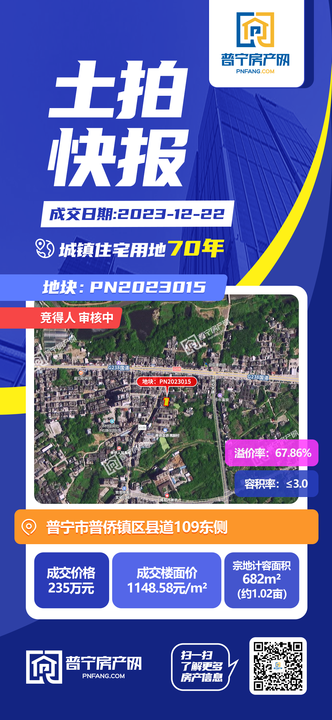 PN2023015地块经过19轮竞价,最终以235万元成功出让,成交楼面价1148.58元/㎡,溢价率67.86%。地块位于普宁市普侨镇区县道109东侧,占地面积682平方米,为70年城镇住宅用地。