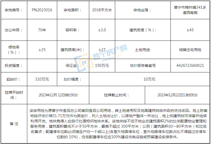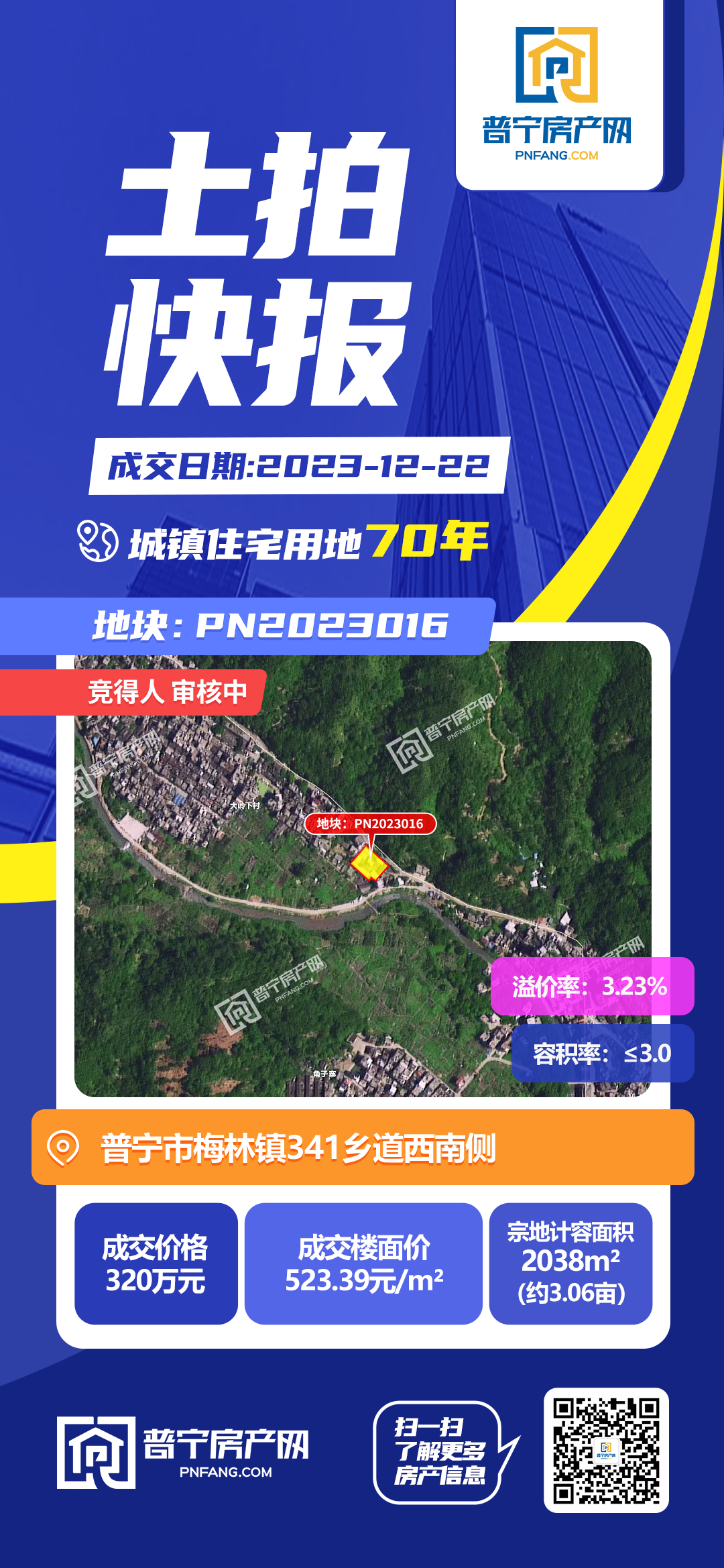 PN2023016地块经过2轮竞价,以320万元成功出让,成交楼面价523.39元/㎡,溢价率3.23%。地块位于普宁市梅林镇341乡道西南侧,占地面积2038平方米,为70年城镇住宅用地。