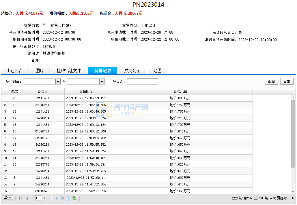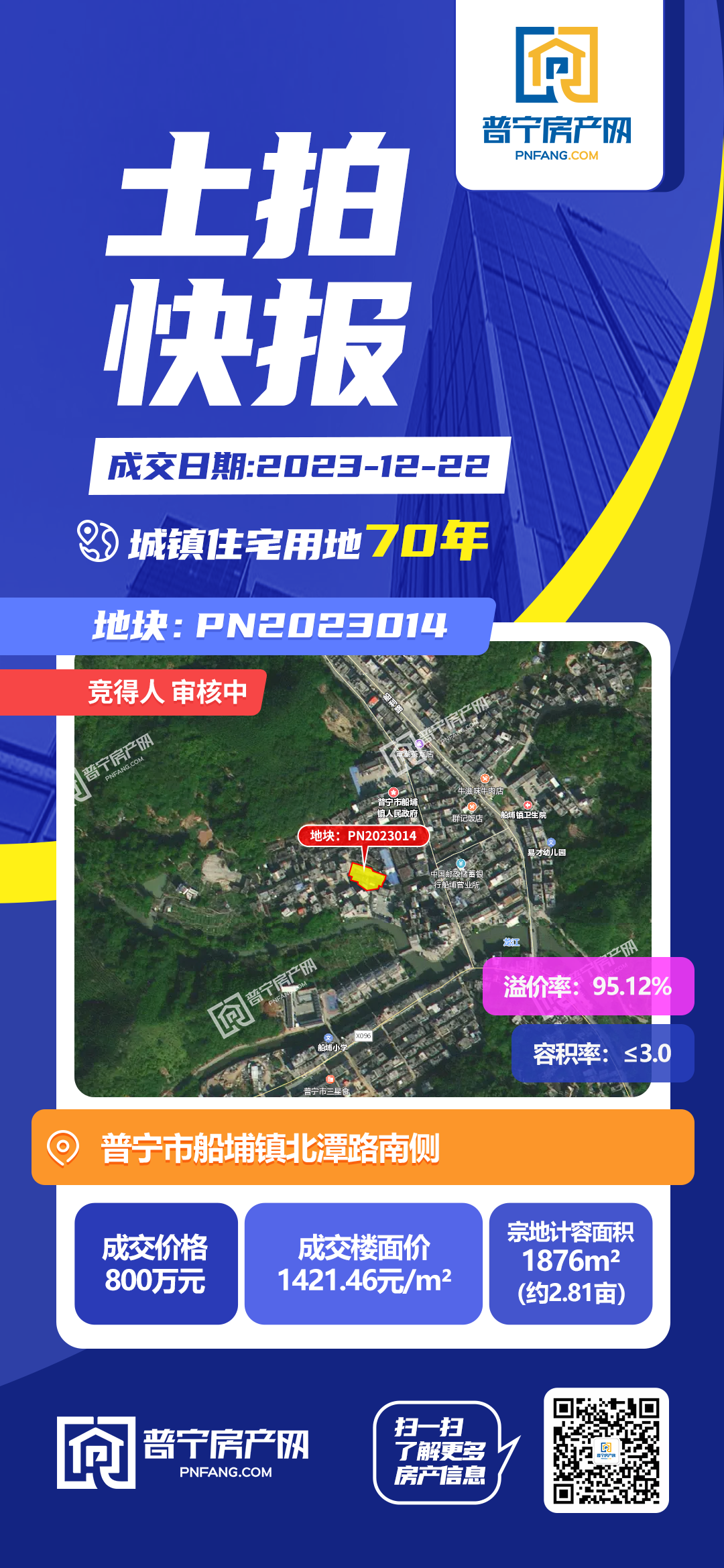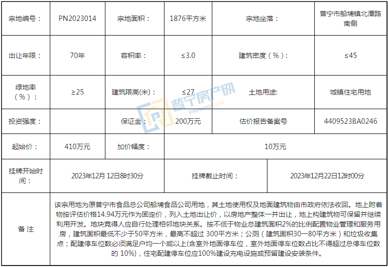 PN2023014地块经过20轮竞价,以800万元成功出让,成交楼面价1421.46元/㎡,溢价率95.12%。地块位于普宁市船埔镇北潭路南侧,占地面积1876平方米,为70年城镇住宅用地。