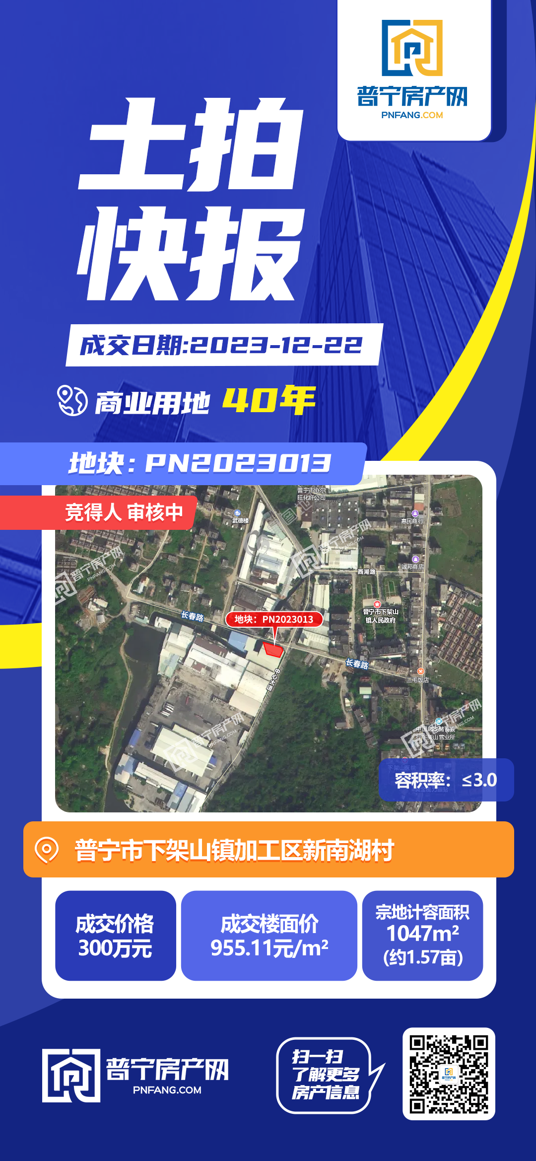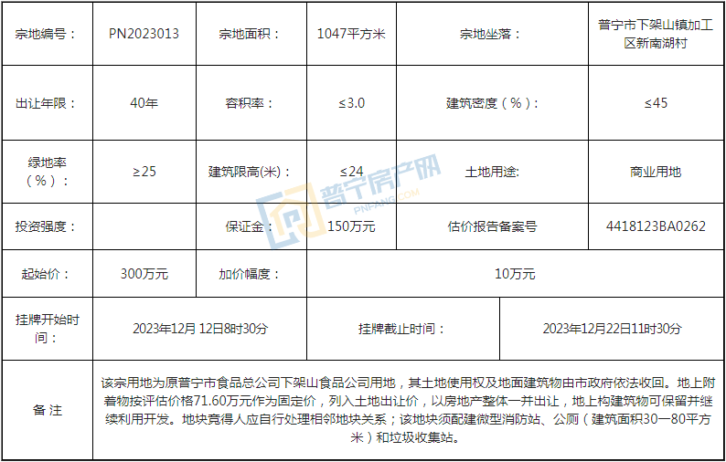 PN2023013地块位于普宁市下架山镇加工区新南湖村,占地面积1047平方米,以300万元成功出让,成交楼面价955.11元/㎡,为40年商业用地。