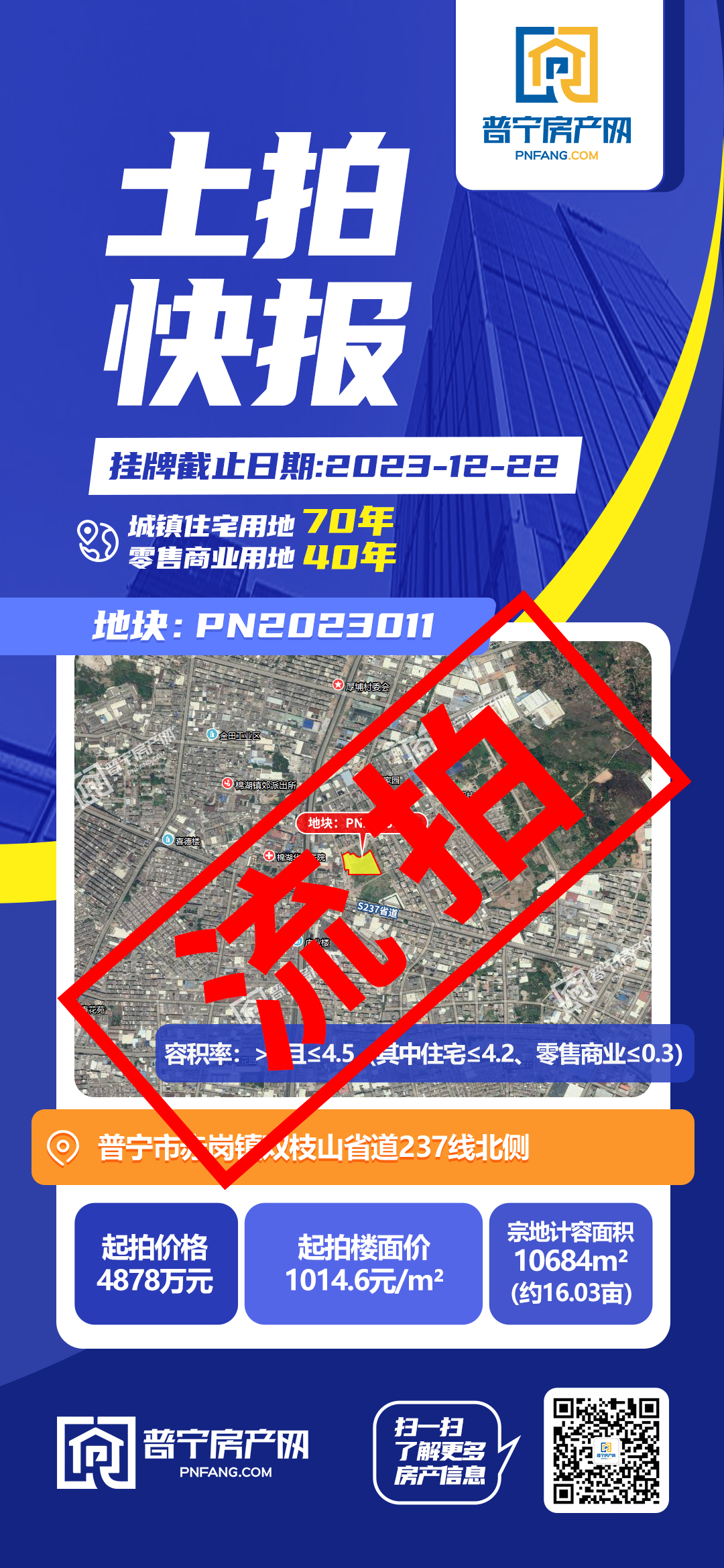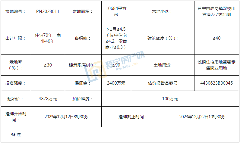 PN2023011地块位于普宁市赤岗镇双枝山省道237线北侧,占地面积10684平方米,起拍价4878万元,为住宅70年、商业40年城镇住宅用地兼容零售商业用地,因无人出价意外流拍。据悉该地块将作为双枝山安居楼项目。