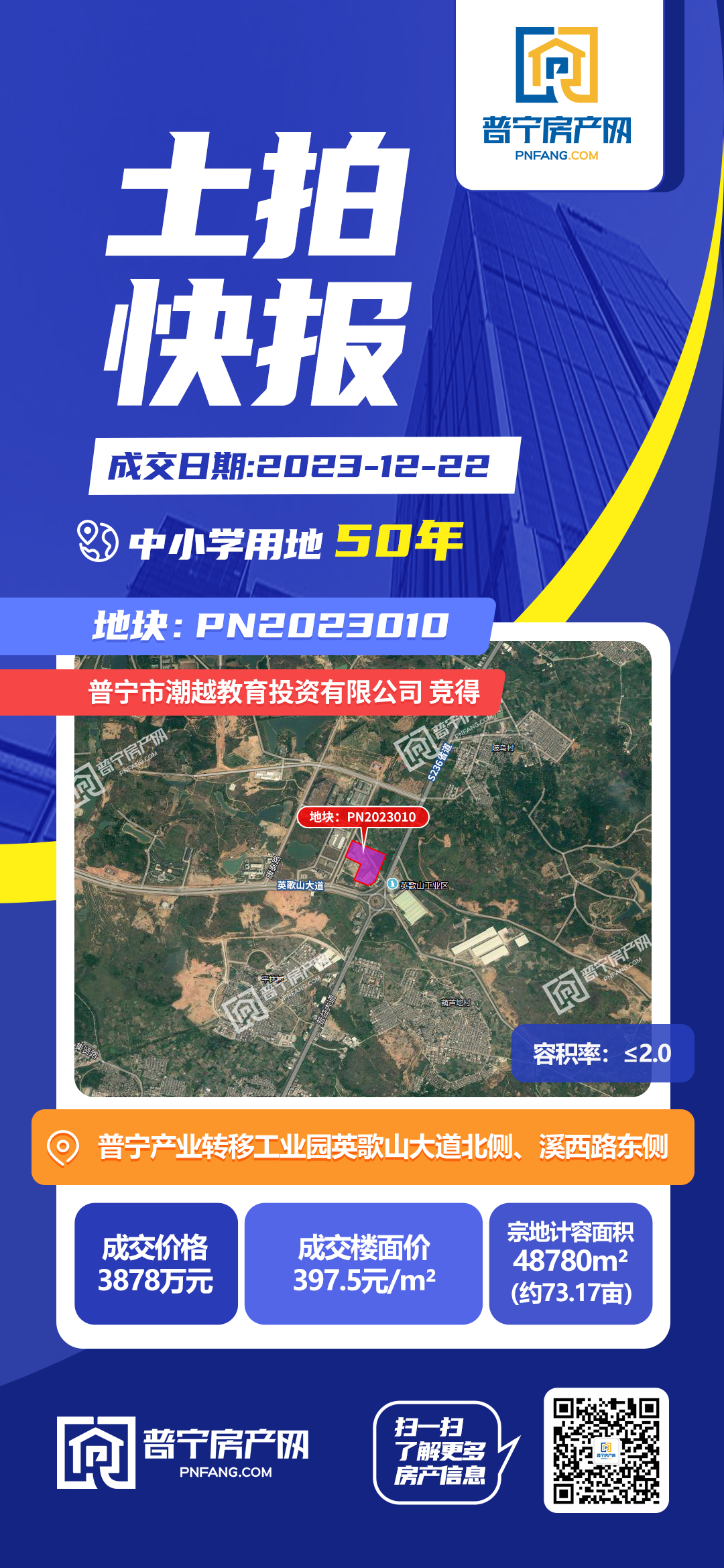PN2023010地块以3878万元成功出让,成交楼面价397.5元/㎡,由普宁市潮越教育投资有限公司竞得。地块位于普宁产业转移工业园英歌山大道北侧、溪西路东侧,占地面积48780平方米,为50年中小学用地。据了解,PN2023010号出让地块拟作为中小学教育项目用地。