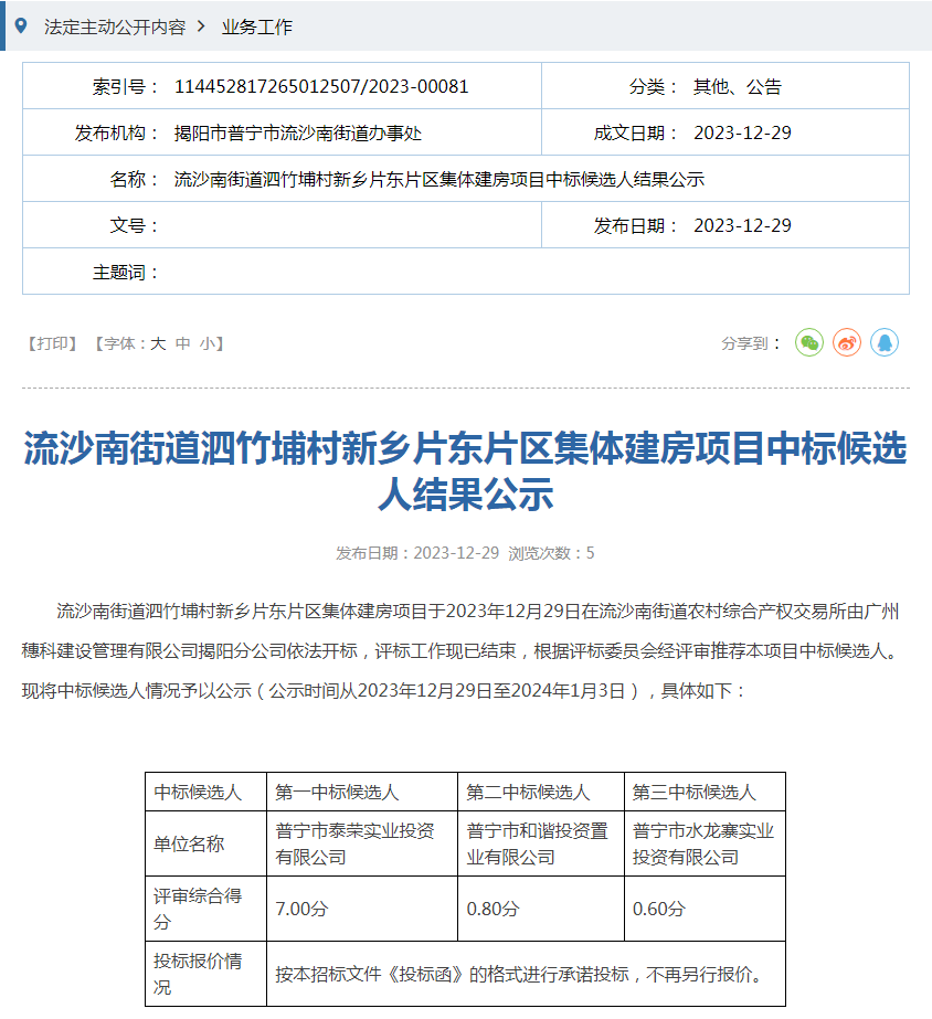近日,据小房君了解,流沙南街道泗竹埔村新乡片东片区集体建房项目于2023年12月29日在流沙南街道农村综合产权交易所由广州穗科建设管理有限公司揭阳分公司依法开标,评标工作现已结束,普宁市泰荣实业投资有限公司为第一中标候选人。项目规划面积约38.7亩,项目用地性质为二类居住用地(兼容商业用地)。具体内容如下:
