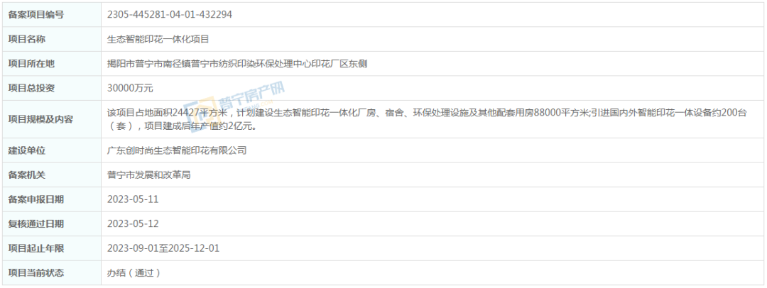 据了解,2023年5月,生态智能印花一体化项目通过备案,总投资3亿,位于普宁市南径镇普宁市纺织印染环保处理中心印花厂区东侧,建设单位为广东创时尚生态智能印花有限公司。该项目占地面积24427平方米,计划建设生态智能印花一体化厂房、宿舍、环保处理设施及其他配套用房88000平方米;引进国内外智能印花一体设备约200台(套),项目建成后年产值约2亿元。