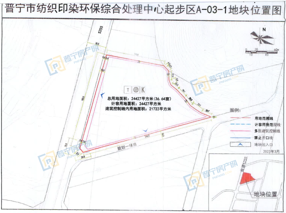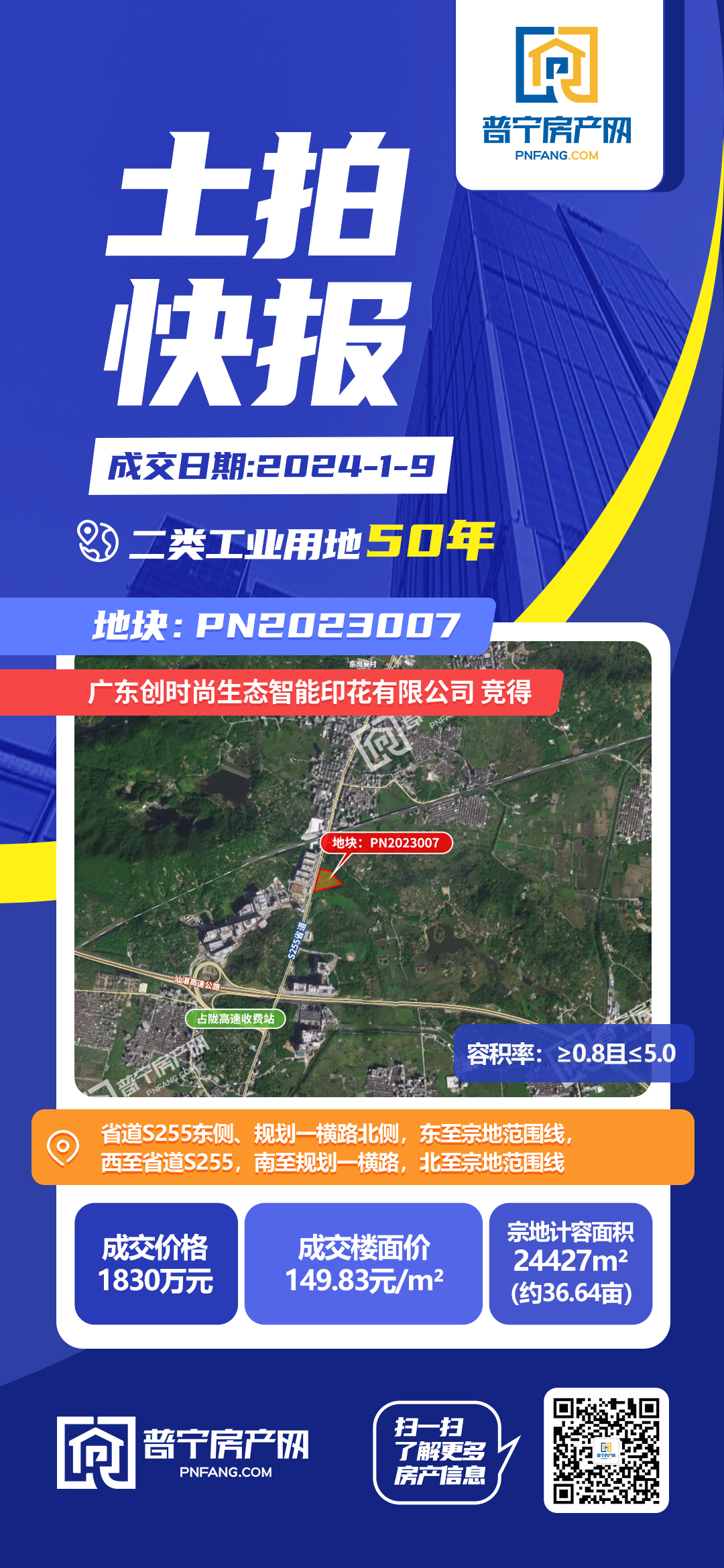 PN2023007地块位于省道S255东侧、规划一横路北侧,东至宗地范围线,西至省道S255,南至规划一横路,北至宗地范围线,占地面积24427平方米,为50年二类工业用地,被广东创时尚生态智能印花有限公司以1830万成功竞得。