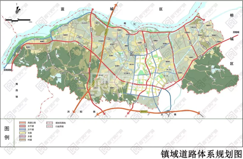 镇主干道:镇区的主干道规划道路红线宽32m(具体要求按控制性规划执行),用于连接主要对外交通和组织镇区内部交通。