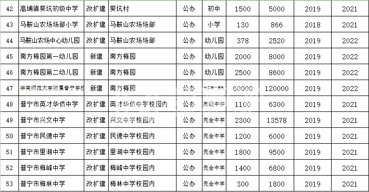 根据需求,普宁市从2018年至2022年,将新建幼儿园19所、新建小学1所、新建中学1所;改扩建幼儿园8所,改扩建小学10所、改扩建中学14所;新增学位23267个,其中幼儿园增加学位6596个,小学增加学位6114个,中学增加学位10557个。全市学校达到幼儿园300所,小学473所,初中93所。全市公办(集体办)幼儿园和普惠性民办幼儿园占比达80%以上,各乡镇场街道提供的公办学位数能满足本辖区户籍适龄儿童入园需求。