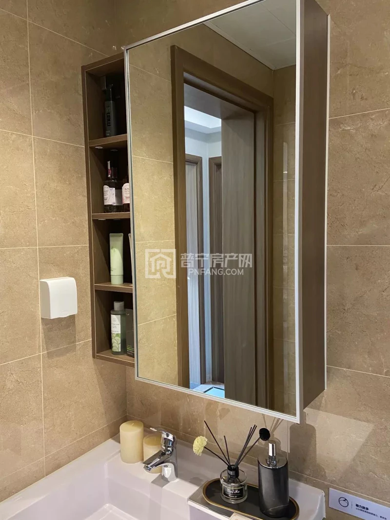 洗手间收纳:一体化镜柜设计,大大增强了收纳功能,让洗手间整洁有度;洗手池下方,专门预留有空间来放置儿童浴盆,小凳子、体重秤等物品,有效节省空间。