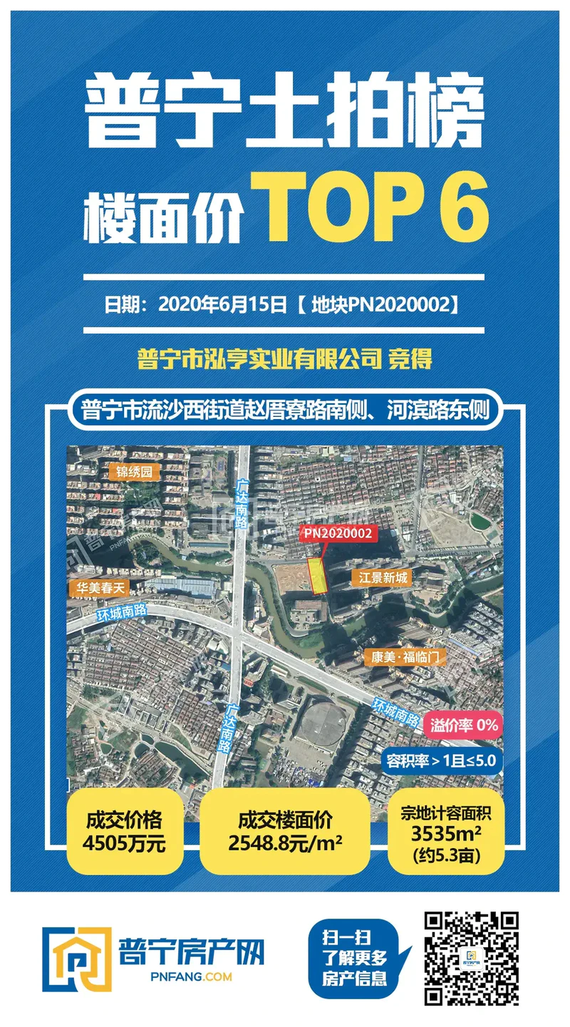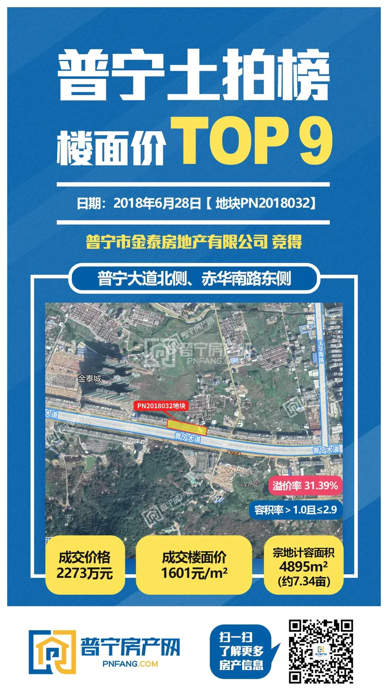 2020年上半年土拍大战已经悄然落幕,为了让广大粉丝能够对普宁楼市更加了如指掌,小房君特地整理了“普宁土拍之楼面价TOP10”(仅统计住宅用地)。话不多说,接下来一一揭晓。 *排行榜数据截止日期为发文日期,仅供参考。 PN2019039 PN2019039地块以1980万元被普宁市松雁实业投资有限公司拍下,楼面价1448.64元/m²,位列TOP10。 该地块与松雁实业此前拍下的PN2019003地块紧密相连,两个地块面积共计62.13亩,目前项目名未确定。地块位于普宁大道,北面是普宁高铁站,周边楼盘集中,区域优势明显。 PN2018032 PN2018032地块以2273万元被普宁市金泰房地产有限公司拍下,楼面价1601元/㎡,位列TOP9。 该地块项目名为欢乐颂,按公示要求,须按商业街设计要求进行。目前金泰欢乐颂城市展厅已开放。 PN2018001 PN2018001地块以7880万元被普宁市翔桦地产有限公司(翔栩地产)拍下,楼面价2316.57元/㎡,位列TOP8。 水岸城鸟瞰图▲ 该地块项目名为水岸城,与PN2018002、PN2018060、PN2018061均为同一项目。 PN2020001 PN2020001地块以27500万元的价格被普宁市翔栩房地产开发有限公司拍下,楼面价2403.33元/㎡,位列TOP7。 该地块为东市(新安片区)“三旧”改造首期项目,项目总面积为231.45亩,规划定位为市中心居住片区的重要组成部分,布局完整,合理,以居住为主,兼有医疗、商业办公,配套完善的综合片区,打造为“三旧”改造示范点。项目于5月1日当天举行二期拆迁补偿安置签约仪式。 新安片区“三旧”改造鸟瞰图▲ 新安片区“三旧”改造效果图▲ PN2020002 PN2020002地块以4505万元的价格被普宁市泓亨实业有限公司拍下,楼面价2548.8元/㎡,位列TOP6。 该地块项目名为江景新城二期(楼盘详情户型图相册地图0663-2559559),地块将规划为公共设施齐全、布局完整、环境较好的居住小区,周边有高档小区及学校公园医院等生活配套,区域位置优越。 PN2018002 PN2018002地块以1.305亿元被普宁市翔桦地产有限公司(翔栩地产)拍下,楼面价3091.38元/㎡,位列TOP5。 水岸城鸟瞰图▲ 该地块项目名为水岸城,与PN2018001、PN2018060、PN2018061均为同一项目。