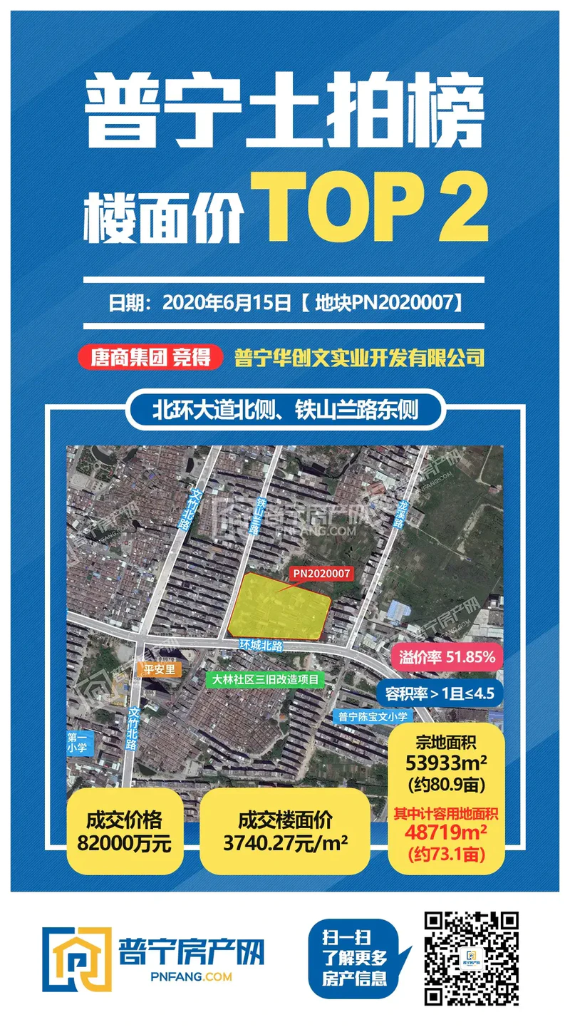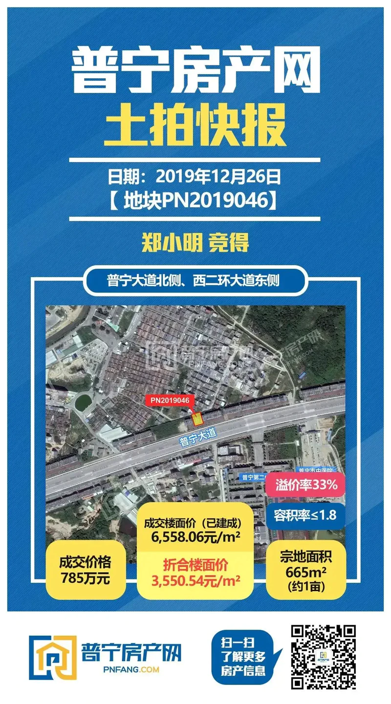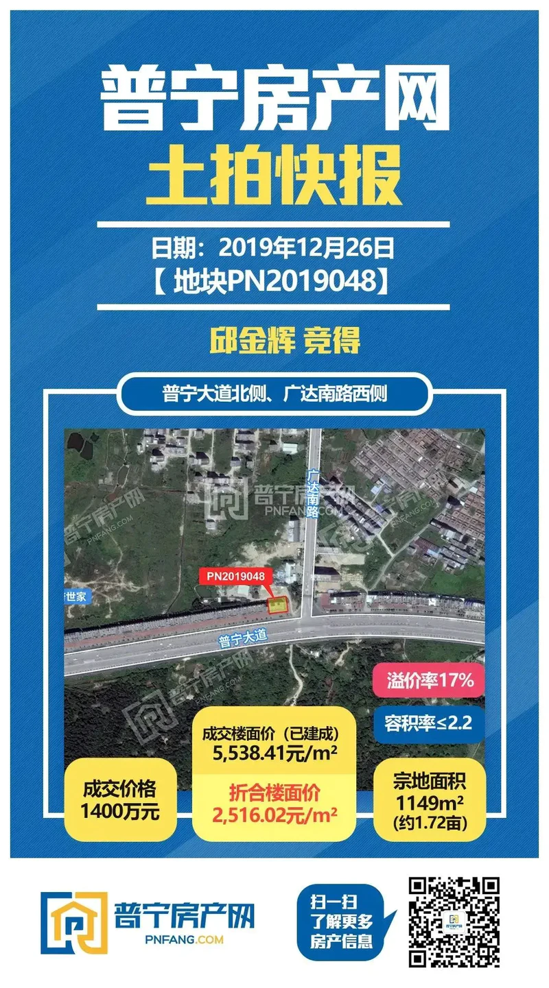 PN2019047 PN2019047地块以5080万元被普宁市金裕实业投资有限公司拍下,楼面价为2866.79元/m²(不包括地面建筑),实际楼面价为5877.04元/m²(包括地面建筑)。 该地块一二层作为商业经营场地,土地出让年限40年,三层及以上作为住宅用地,土地出让年限70年。 PN2019048 PN2019048地块以1400万元被邱金辉拍下,楼面价为2516.02元/m²(不包括地面建筑),实际楼面价为5538.41元/m²(包括地面建筑)。 该地块一二层作为商业经营场地,土地出让年限40年,三层及以上作为住宅用地,土地出让年限70年。