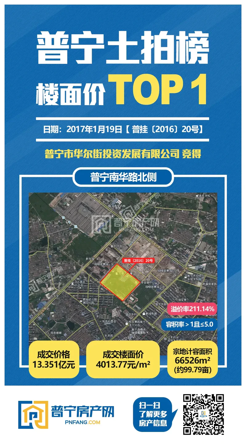 普挂〔2016〕20号 普挂〔2016〕20号地块以13.351亿元被普宁市华尔街投资发展有限公司(盛迪嘉集团)拍下,楼面价为4013.77元/㎡,位列TOP1。 该地块项目名为光明一号,目前该楼盘二期已交楼。