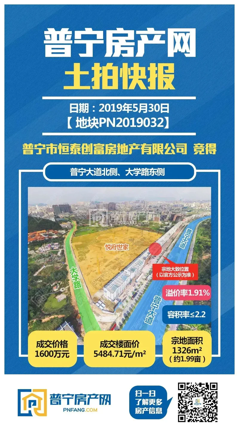 PN2019032 PN2019032地块以1600万元被普宁市恒泰创富房地产有限公司拍下,楼面价5484.71元/㎡。 最“特殊”的莫过于这个地块了。据了解,该地块计划建成悦府世家营销中心的大门。