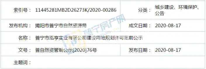 普宁市泓亨实业有限公司建设用地规划许可批前公示